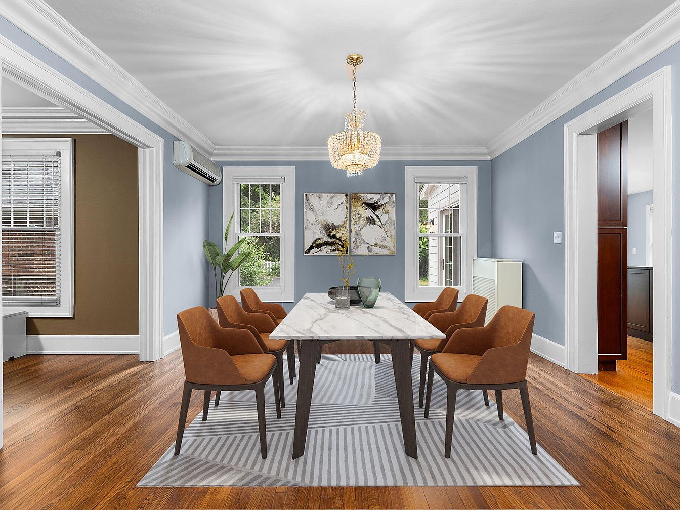 This dining room features a contemporary design with a color palette of soft blue walls and rich wood tones. A modern marble-topped dining table is central, surrounded by six stylish, brown upholstered chairs. The textured, striped area rug adds warmth beneath the table. Natural light floods the space through large windows framed by white trim, enhancing the inviting atmosphere. A striking chandelier hangs overhead, reflecting light and adding elegance. Architectural details like crown molding and a sleek air conditioning unit blend functionality with aesthetics, while a vibrant piece of art adorns the wall, completing the sophisticated look.