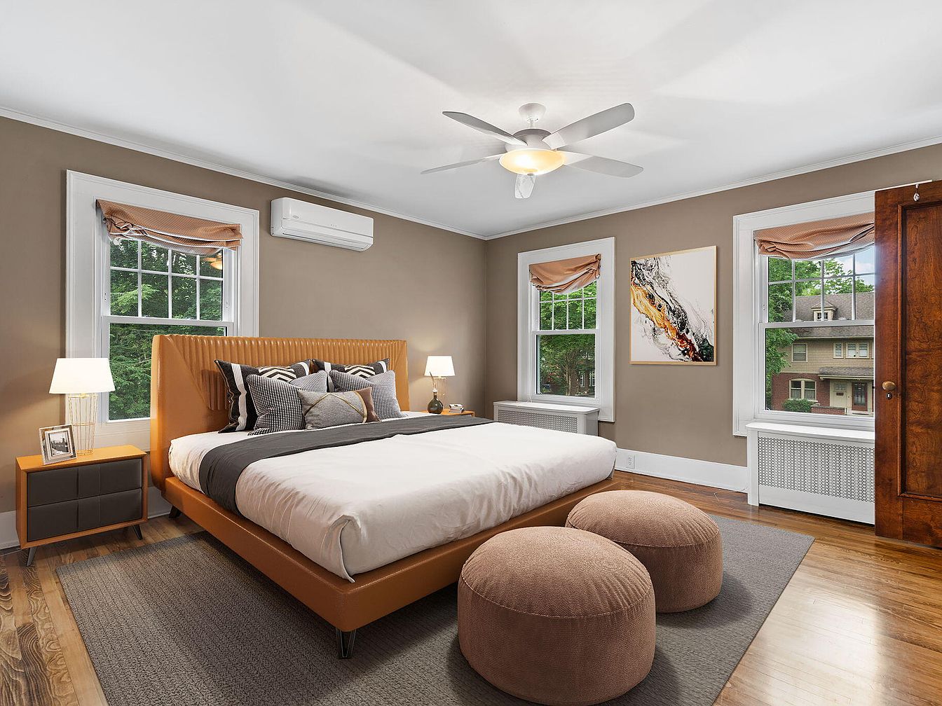 This cozy bedroom features a modern design with a warm color palette of earthy browns and soft whites. The focal point is a padded headboard integrated with an orange-brown hue, complemented by a crisp white bedspread and patterned throw pillows. Flanking the bed are minimalist bedside tables, showcasing elegant lamps. Natural light illuminates the space through two large windows adorned with soft valances. The room includes a ceiling fan for comfort, while hardwood floors lead to plush area rugs, adding texture. An abstract artwork on the wall introduces a splash of color, enhancing the room’s inviting atmosphere.