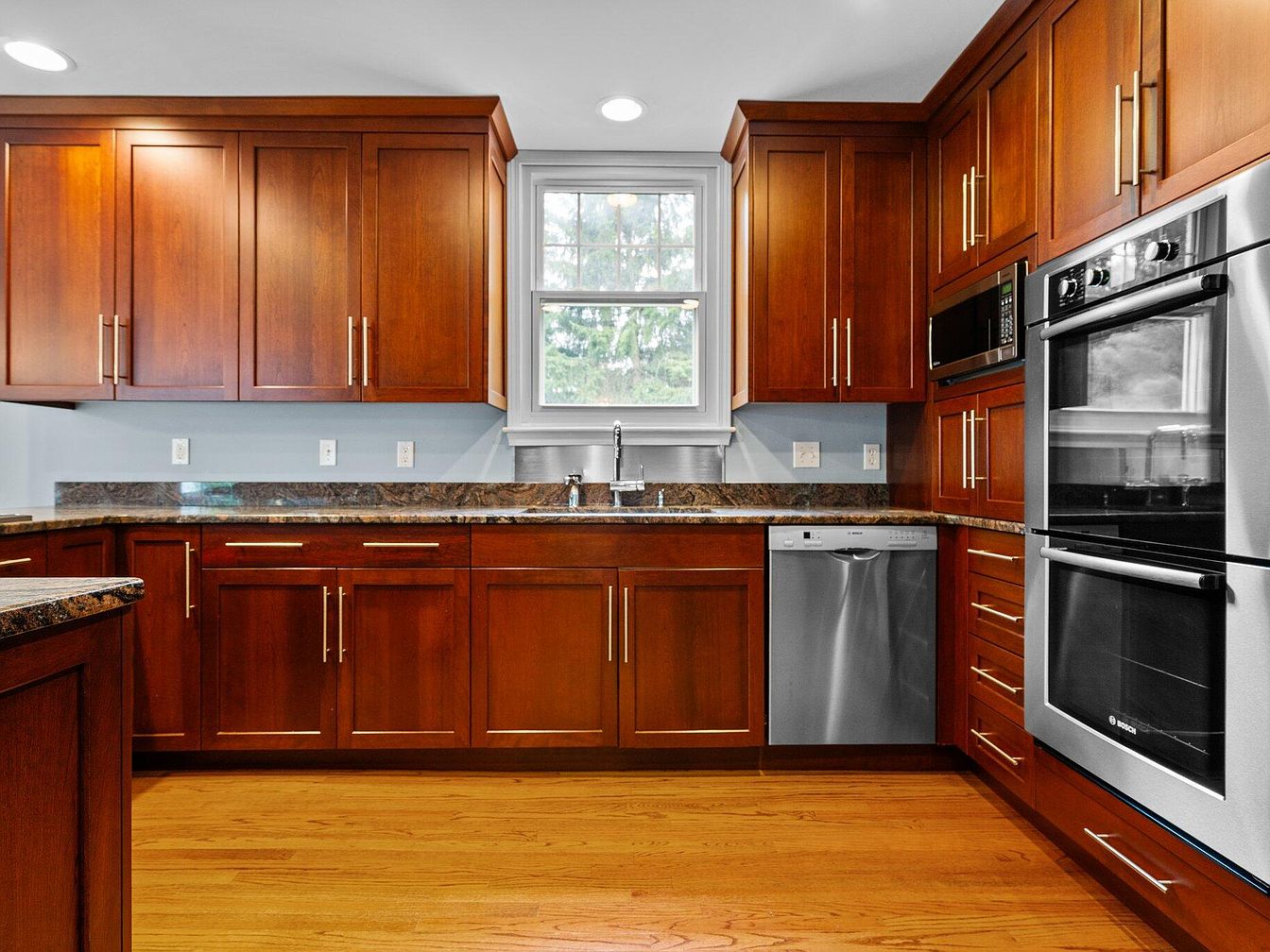 This modern kitchen features rich, dark wood cabinetry that creates a warm and inviting atmosphere. The upper cabinets have a classic, paneled design, complemented by sleek metallic handles that add a contemporary touch. The countertops are a dark, polished stone, enhancing the kitchen’s elegance. Stainless steel appliances, including an oven and microwave, contrast with the wood, offering a stylish functionality. A large, bright window provides natural light, illuminating the space. The hardwood floor enhances the kitchen’s charm, grounding the design in a timeless aesthetic that balances modern convenience with traditional warmth.