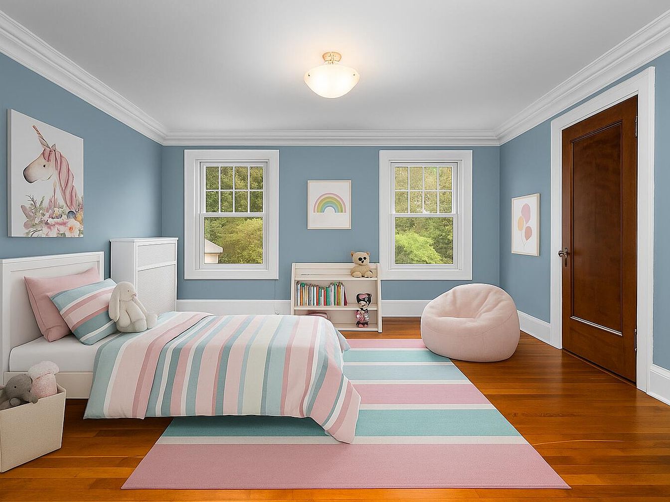 This child’s bedroom features soft blue walls complemented by white trim and crown molding, creating a cheerful and serene atmosphere. A cozy white bed adorned with pastel-striped bedding invites relaxation. Two large windows flood the space with natural light, framed by gentle views of greenery outside. A simple wooden bookcase displays plush toys and books, adding a playful touch. A large, round, blush pink bean bag chair offers additional seating for comfort. The floor is polished wood, accented by a striped area rug in soft pastels, harmonizing beautifully with the overall color scheme and design.