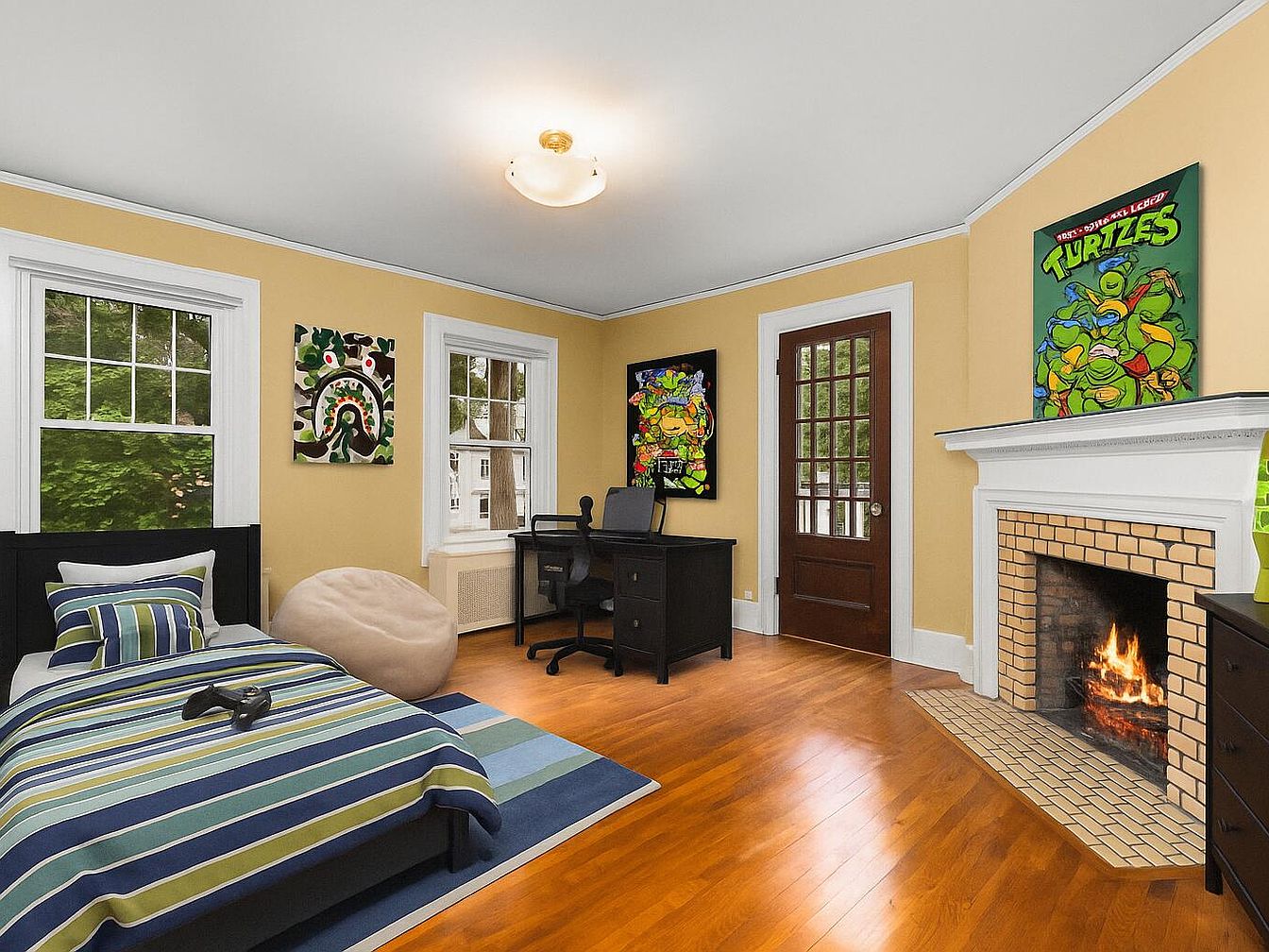 This bedroom features a cozy and inviting atmosphere with warm yellow walls and polished hardwood floors. A black platform bed dressed in blue and green striped bedding is accented by matching throw pillows. Nearby, a playful bean bag offers additional seating. A sleek desk with a chair is positioned near a window, ideal for studying. The room showcases colorful retro artwork on the walls, including iconic cartoon characters, adding vibrancy. Natural light floods through large windows, enhancing the spacious feel, while a decorative fireplace with brick detailing adds a classic touch, blending modern and traditional aesthetics.