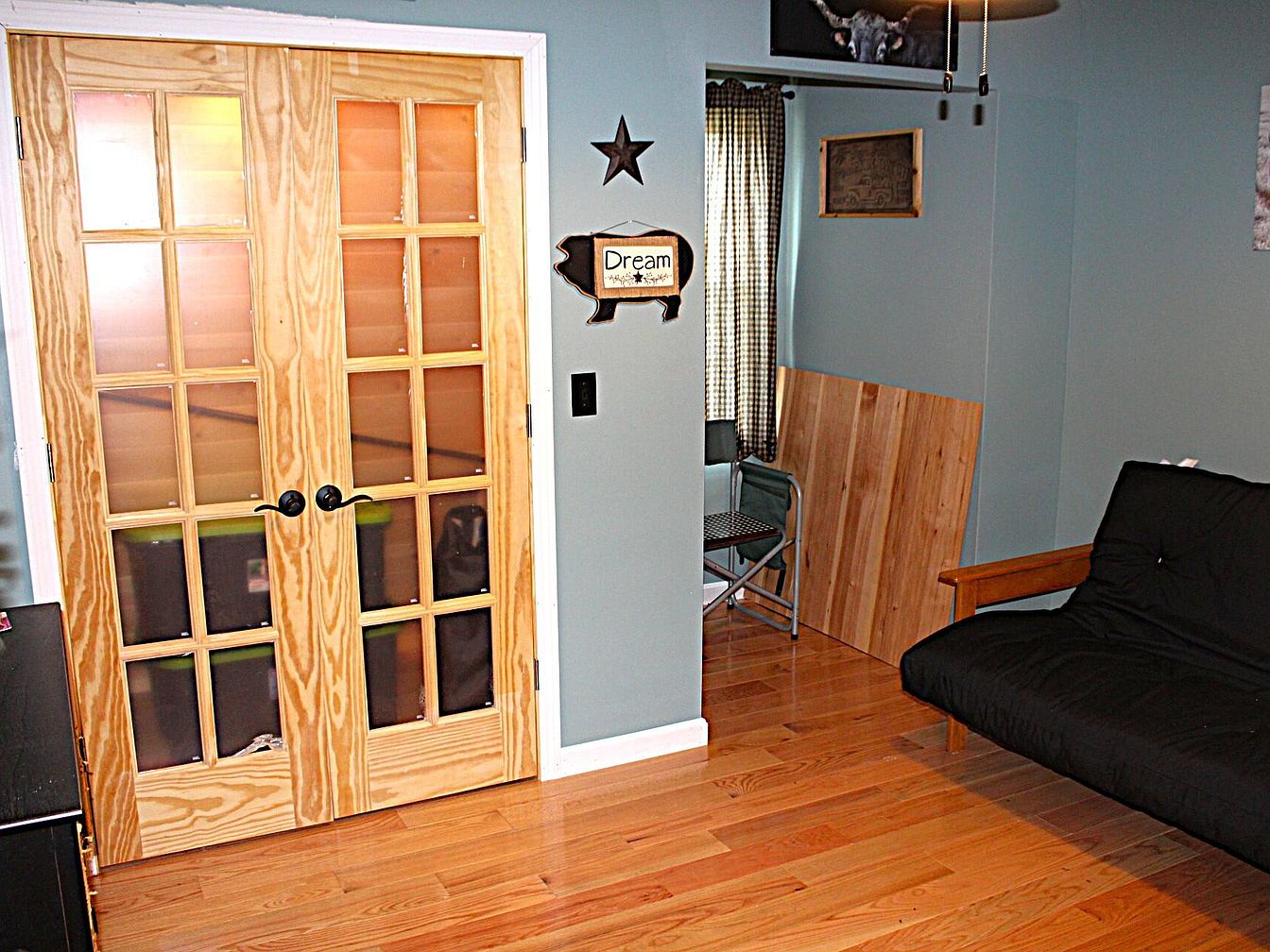 Double wooden French doors with multiple glass panes create an inviting entryway. The walls are painted a soft blue-gray, offering a calming backdrop. Honey-toned hardwood floors add warmth to the space. A black futon with wooden armrests sits in the right corner, adding functional seating. To the left, stacked storage bins are visible through the door panes. A small nook features a folding chair and checked curtains. Wall decor includes a wooden sign with the word ‘Dream,’ a star ornament, and framed artwork. The overall aesthetic balances coziness and practicality, mixing natural wood with soothing colors and personal touches.
