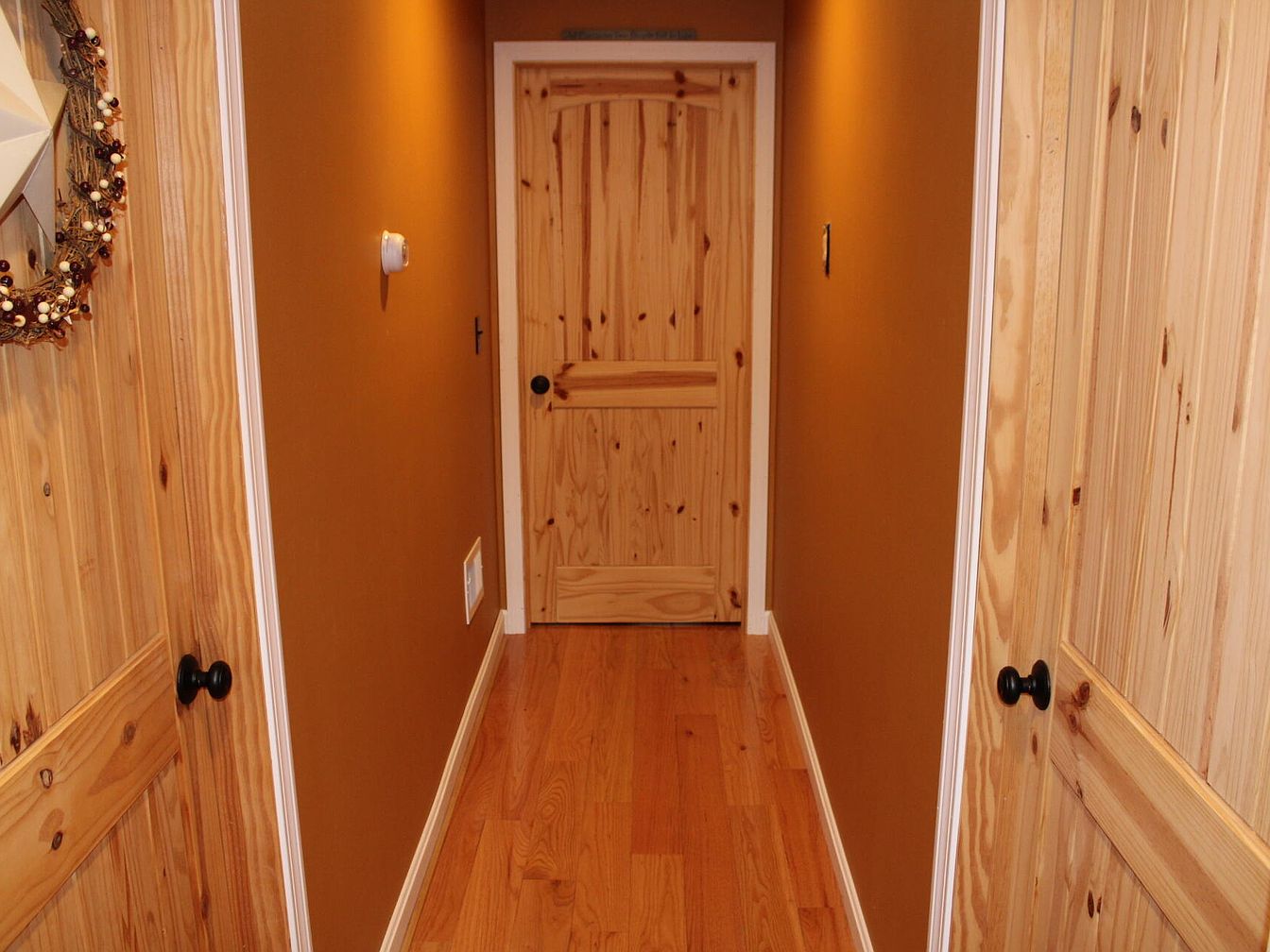 A narrow hallway with warm, earthy tones features rich, honey-colored wood floors and matching natural wood doors, each framed with white trim. The walls are painted a burnt orange shade, creating a cozy and inviting atmosphere. Both sides of the hallway have doors with black round knobs, adding a subtle contrast. On the left wall, a decorative wreath made of twigs and small berries adds a rustic charm. The end of the hallway is centered by another matching wood door. The use of natural materials and color palette gives the space a warm, country feel.