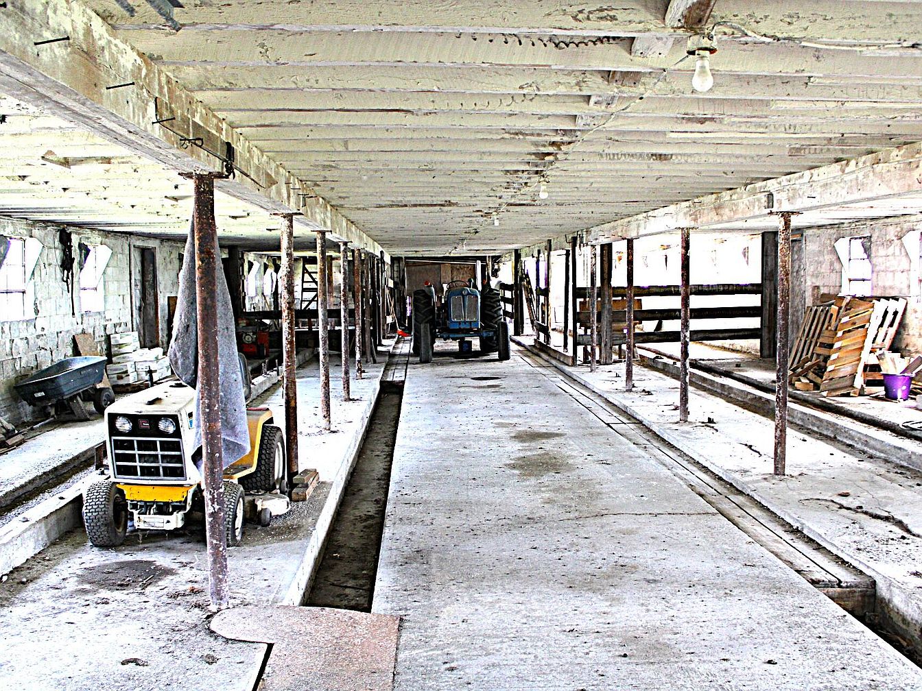 A long, narrow barn with rough concrete flooring and whitewashed wooden ceiling beams supported by metal poles. The space is brightly lit by daylight streaming through multiple rectangular windows along both sides. Farming equipment, including a small yellow tractor and another blue tractor, is stationed along the central aisle. On the right, wooden railings and feed troughs hint at former livestock use. Assorted items like palettes, a purple bucket, and a wheelbarrow are scattered throughout, contributing to a utilitarian atmosphere. The walls are built of exposed masonry blocks, and the overall look is rustic and practical rather than decorative.