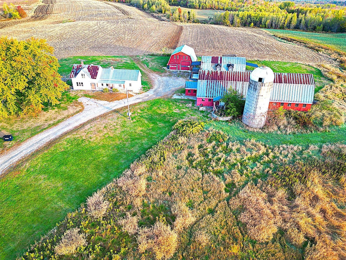 A sweeping aerial view of a historic American farmstead displays a white farmhouse with a rusted red and green metal roof, positioned among lush green lawns and a curving dirt driveway. The centerpiece is a cluster of classic red barns with weathered metal roofs, and a tall concrete silo adjacent to the buildings. Wide expanses of fields, some plowed and some covered in golden wild grasses, stretch out from the buildings. Mature trees border one side of the property, while dense woodland frames the cultivated fields, enhancing the rural, pastoral aesthetic with vibrant late-season colors and open skies.