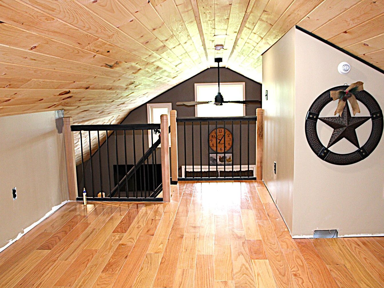 Narrow wooden floored loft area with a sloped wood plank ceiling above. Rails with wooden posts and black metal spindles create a safety barrier near the edge, and a ceiling fan hangs from below. Walls are painted in a warm tan shade, and a rustic decorative metal star hangs on one side, tied with a small burlap ribbon. Natural light enters through a window at the far end, enhancing the cozy and airy atmosphere. A large vintage-style wall clock is visible on the wall below, connecting the loft visually to the main living space underneath.