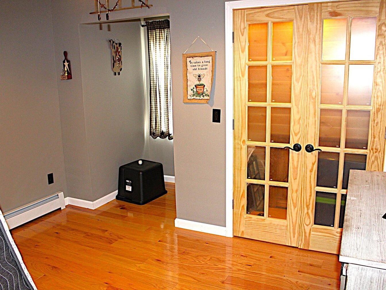 Warm honey-toned hardwood floors contrast with soft gray walls, creating a cozy yet modern ambiance. A set of double French doors with clear glass panes and natural wood frames acts as a focal point and separates the space from another room, bringing in light and a sense of openness. Decorative details include whimsical wall hangings and a rustic sign for added charm. In a small alcove, checkered curtains partially cover a tall window, lending farmhouse character, while a black heater sits on the floor in the nook. Clean white trim, black hardware, and a simple, functional layout define the space’s design.