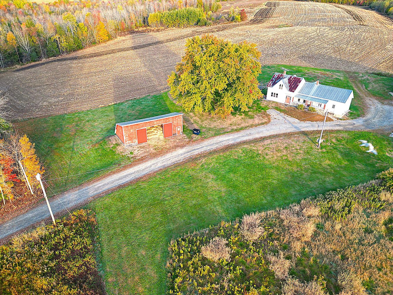 Expansive rural property with a white farmhouse and outbuilding, viewed from above. The farmhouse features a metal roof with rustic red sections and multiple windows on its front facade. Sitting beside a mature tree, the home is surrounded by wide lawns that transition into plowed fields and patches of untamed prairie. A gravel driveway curves past the house and red barn-like structure, both separated from large tilled agricultural land. Autumn trees border the plot with scattered golden, orange, and green foliage, giving a sense of seasonal change and tranquil, open landscape typical of historic American farms.