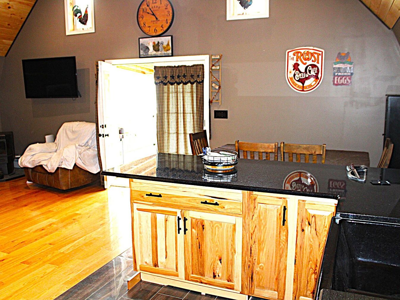 A central kitchen island with warm, natural wood cabinetry and a gleaming black countertop stands out against light hardwood floors and gray walls. Four wooden chairs line the island, inviting casual seating. Farmhouse-inspired decor features vintage-style signs, framed chicken art, and a large wall clock above a patterned curtain covering a glass door. The open-plan space extends into a cozy living area with a plush armchair draped in a white cover, a mounted flat-screen TV, and soft, indirect natural light illuminating the space. The peaked ceiling has honey-toned wood panels, adding rustic charm to the overall design.