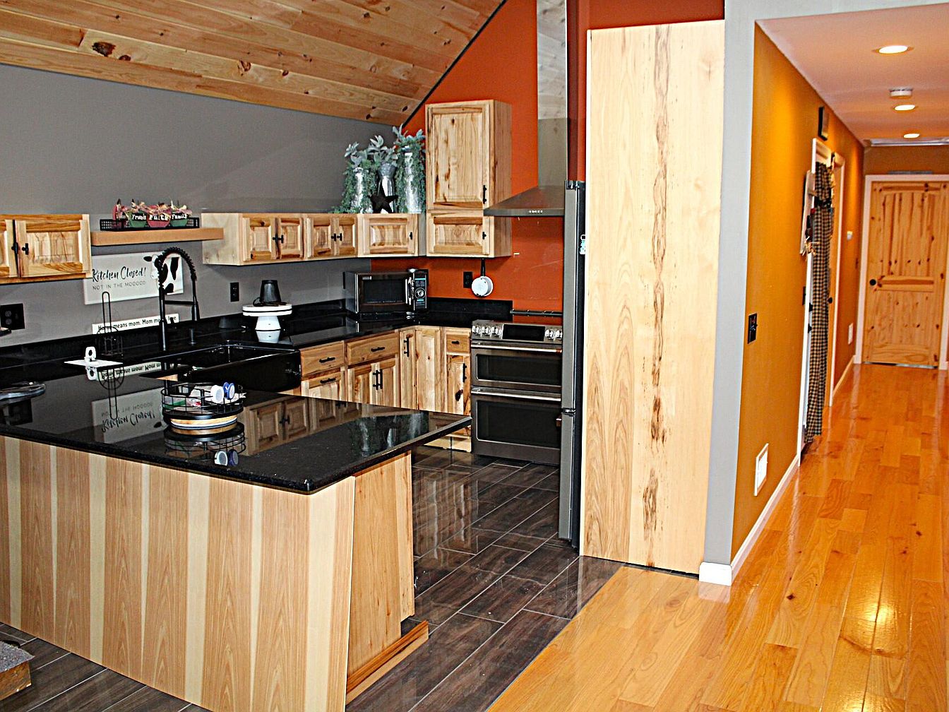 Open-plan kitchen featuring a prominent black granite-topped island with natural wood paneling, offering additional counter space and casual dining options. The cabinetry throughout is crafted from light-hued wood with a distinct grain, lending a rustic, country ambiance. Warm earth-toned walls, a sloped wooden ceiling, and black appliances, including a modern oven and microwave, provide a cozy and inviting atmosphere. Decorative accents such as a farmhouse sign, potted plants, and tiered trays add charm. The kitchen transitions seamlessly into a bright hallway with honey-colored wood flooring, clean sight lines, and recessed ceiling lighting for a unified, welcoming feel.