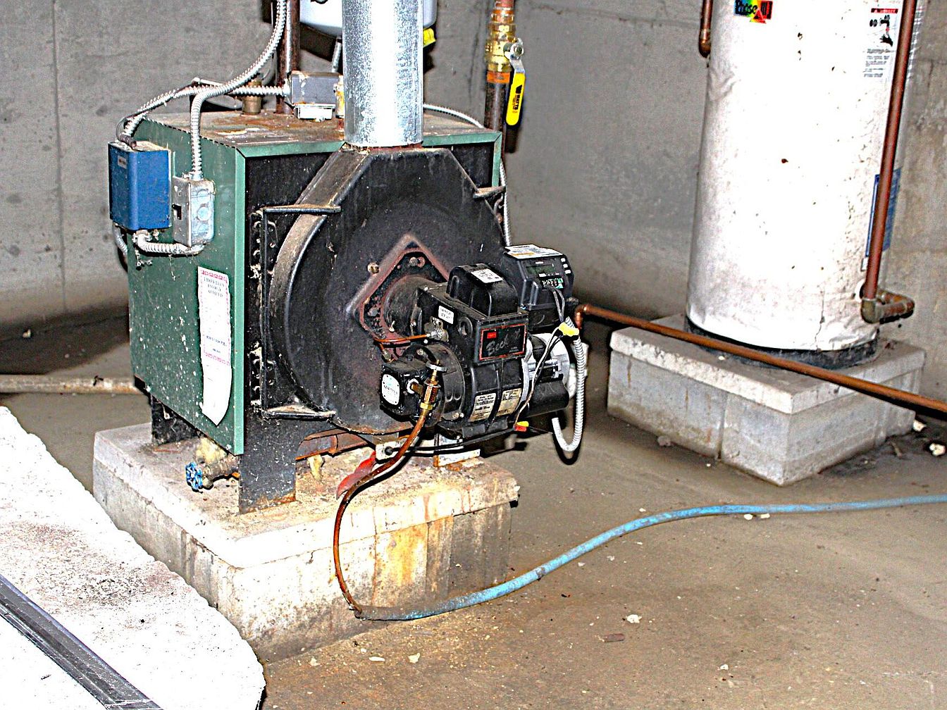 A utilitarian section of the basement features exposed concrete floors and unfinished gray walls, emphasizing a functional rather than decorative atmosphere. Prominently displayed are a large, green boiler unit and a tall white water heater, both set on concrete blocks for elevation. Exposed copper pipes and wiring run along the ceiling and walls, contributing to the industrial look. The space is lit by natural or overhead lighting that casts clear shadows, highlighting the aged, slightly rusty surfaces and stains on the concrete. The overall feeling is one of raw practicality, focused on housing essential mechanical systems.