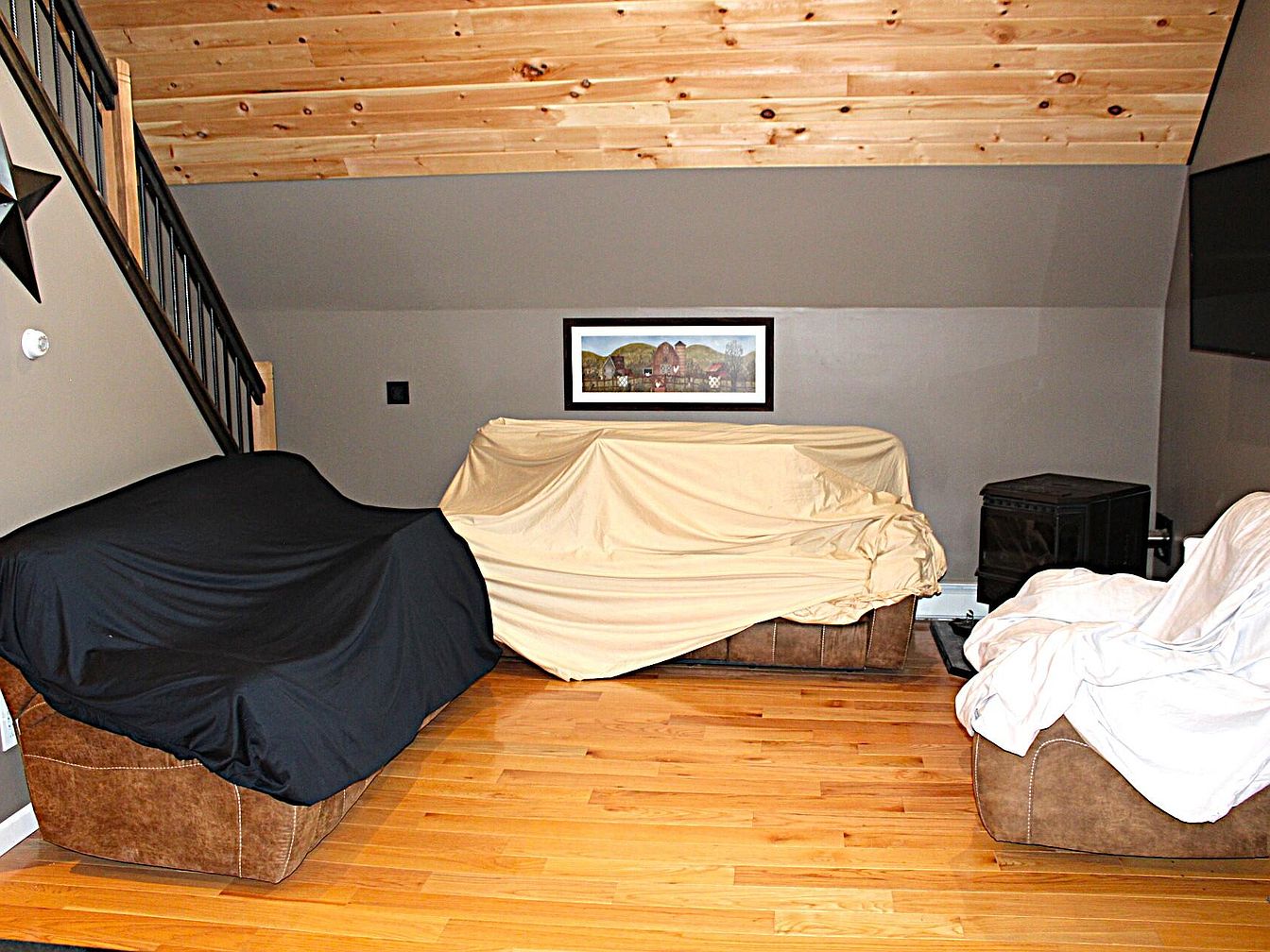 A cozy living room with sloped wooden plank ceilings and warm honey-colored hardwood floors. Three large brown couches are arranged in a conversational layout, each covered with different colored sheets—black, beige, and white—for protection or a casual look. The neutral wall features a framed rural landscape print at its center, offering a subtle artistic touch. A black metal stair railing and a large star decor accent the modern rustic ambiance. The overall color palette is earthy and inviting, with soft natural light brightening the space and a compact black woodstove placed near the rightmost couch for warmth and ambiance.