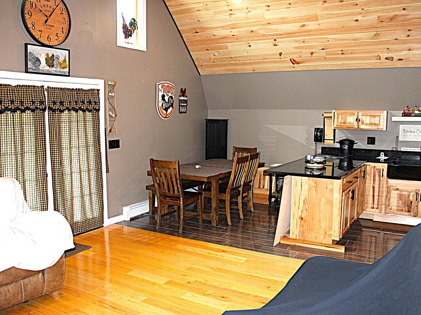 A cozy space with rustic charm and farmhouse-inspired details. The room has slanted, light wood-planked ceilings paired with beige walls, creating warmth. On one side, a compact kitchen features natural wood cabinets, black countertops, and black appliances, including a coffee maker and sink. The adjacent dining area has a wooden table with four matching chairs on dark tile flooring. Large plaid curtains cover a doorway or window to the left, complementing the vintage, rural decor. Wall décor includes signs about fresh eggs and roosters, paintings of chickens, and a large round clock, reinforcing the country aesthetic.