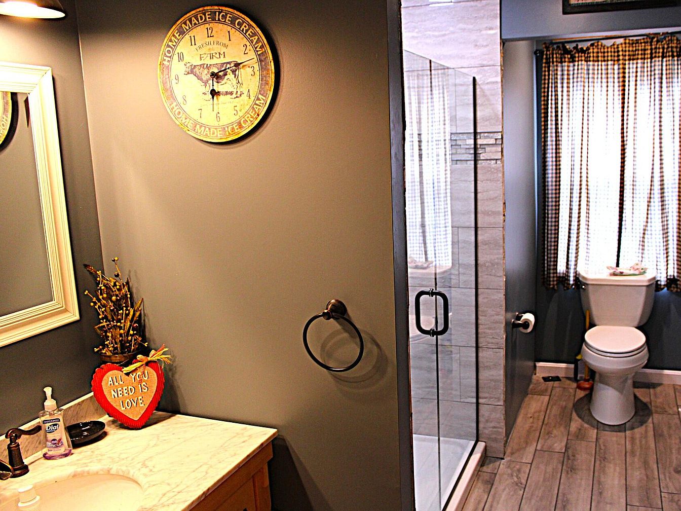A cozy bathroom with a warm, inviting palette of gray and beige. The floor features wood-look tiles, while one wall displays a farmhouse-style round clock with a cow illustration and ‘Home Made Ice Cream’ text. The vanity has a marble countertop, an oil-rubbed bronze faucet, and a large, white-framed mirror. A red heart-shaped cushion that says ‘All You Need Is Love’ adds a personal touch next to a hand soap bottle and a rustic floral arrangement. The glass shower enclosure sits next to a window covered with checkered curtains, and a white toilet rests beneath natural light, completing the comfortable, country-inspired space.