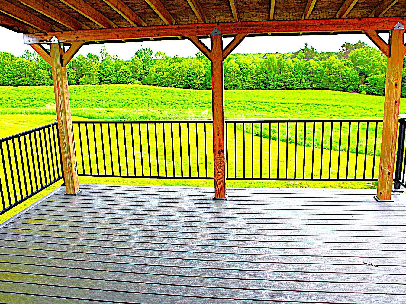 A spacious covered porch with a wooden plank floor and sturdy posts supports a simple open-beam roof overhead. The railings feature evenly spaced black metal balusters, creating a clean, safe boundary around the porch. Beyond, a lush, expansive grassy field gently stretches into the distance, ending in a dense line of trees that form a natural border. The wood beams and floor have a fresh, unfinished look, contributing to a rustic and inviting atmosphere. This space is ideal for outdoor relaxation while enjoying panoramic green countryside views and the tranquility of nature.