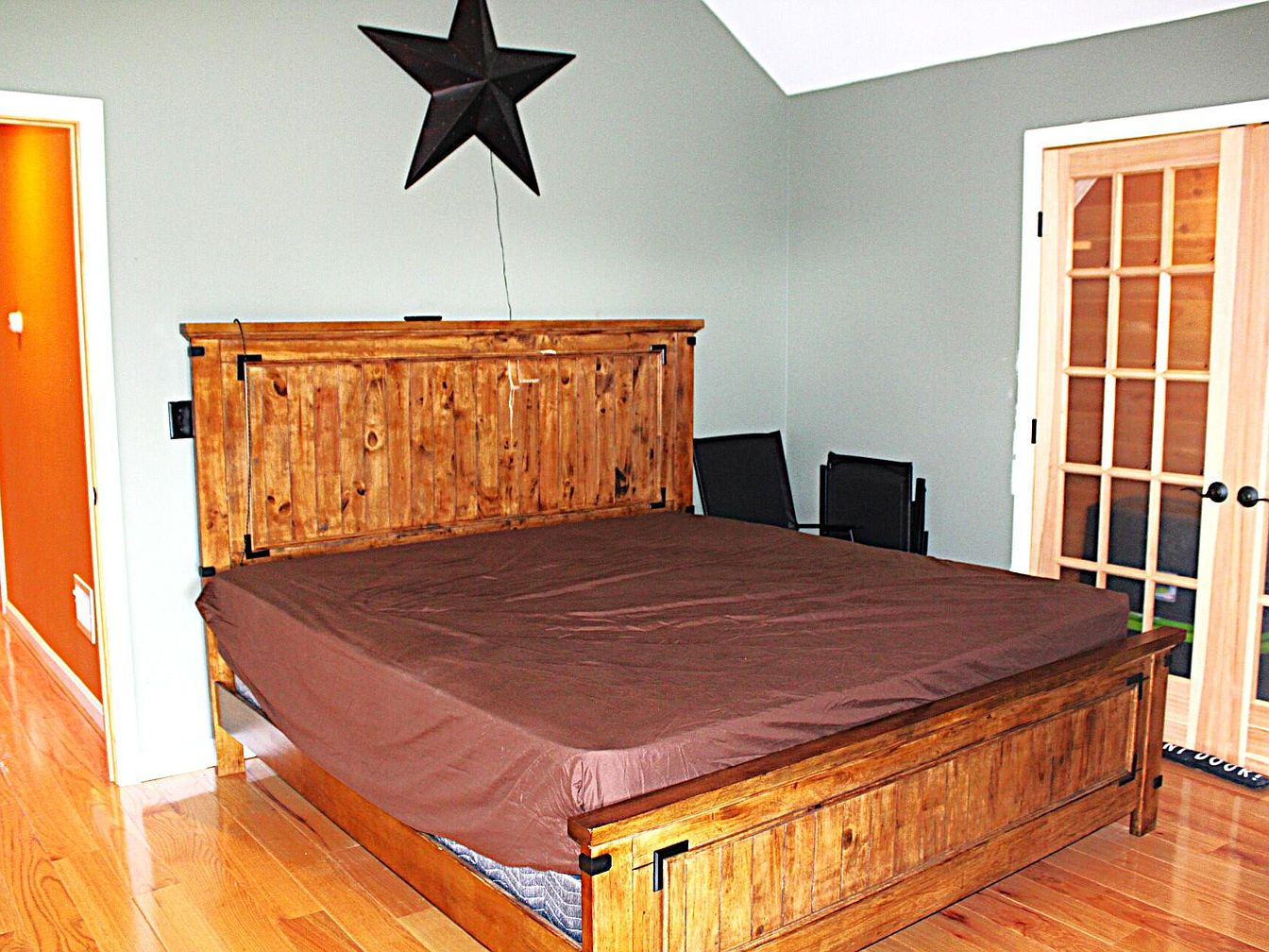A cozy bedroom features a rustic wooden bed frame with a matching headboard and footboard, both highlighting a natural wood grain. The bed is covered in a simple brown fitted sheet. Above the bed, a large black metal star provides a touch of Americana décor. Walls are painted a soft, muted gray, creating a calm and neutral backdrop. To the right, French doors with glass panes and wooden frames open to another room, adding architectural interest. Pale wood flooring brightens the space, while a vibrant orange-painted hallway is visible through the open doorway on the left, adding a pop of color.