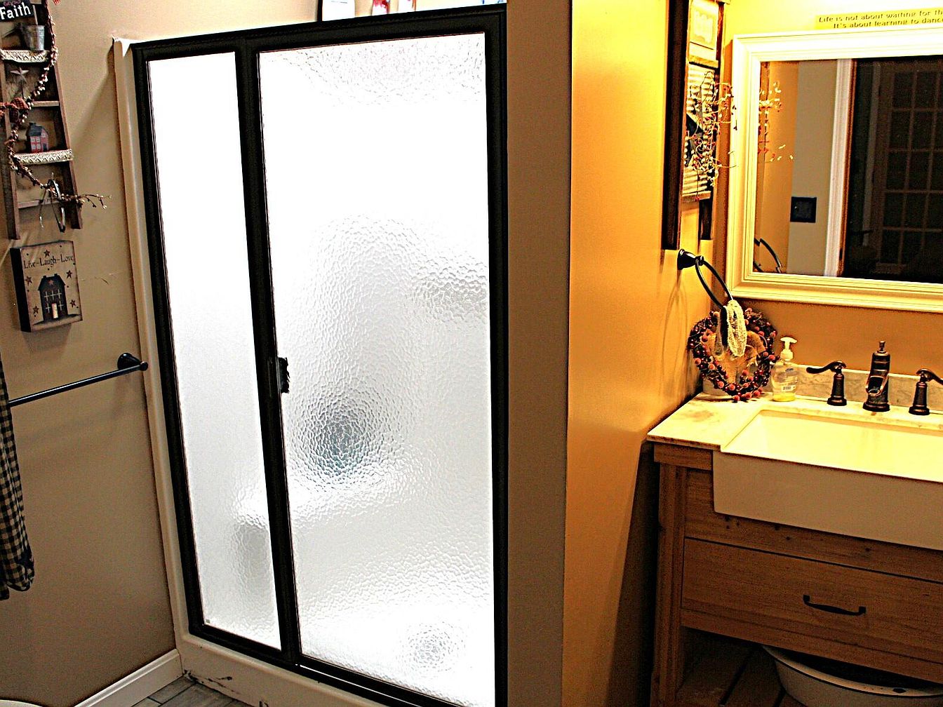 This bathroom features a frosted glass shower enclosure with a black metal frame on the left side. Adjacent to the shower, a rustic wooden vanity sits under a large framed mirror, with a white ceramic vessel sink and oil-rubbed bronze faucet fixtures. The counter is neatly arranged with a hand soap dispenser and a decorative wreath. Warm yellow walls create a cozy ambiance, accentuated by soft lighting. The bathroom displays personalized touches, including wall art and a hanging fabric towel on a metal rod. Clean lines and a farmhouse style blend utility with comfort in this inviting space.