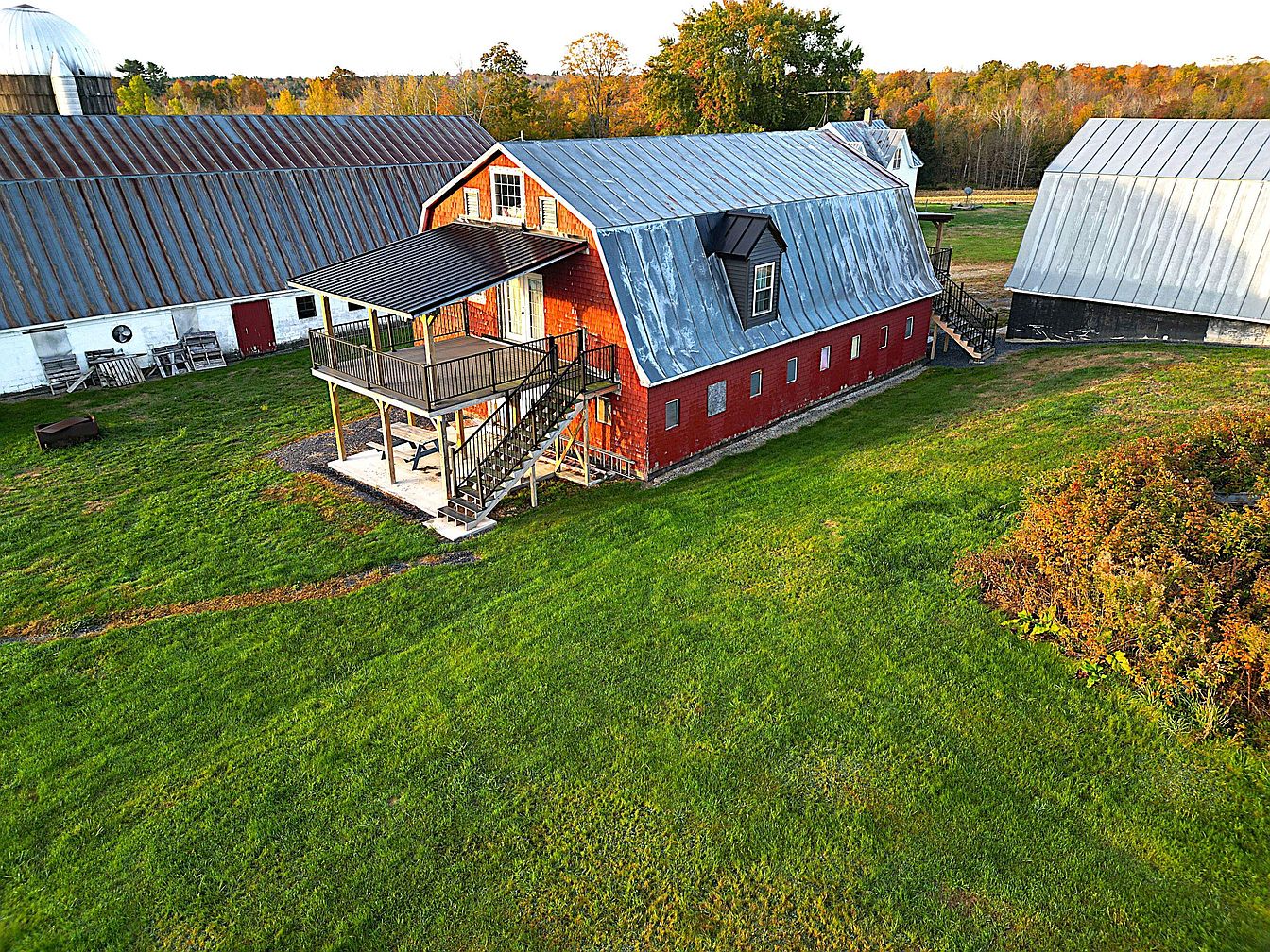 A large red barn with white trim and a metal gambrel roof sits on a wide, grassy property, flanked by other farm outbuildings with similar corrugated metal roofs. The barn features a raised porch accessed by a wooden staircase, with railings and a protected overhang, perfect for sitting outdoors. Small vertical windows line the side, adding rustic charm. Mature autumn-colored trees border the background, highlighting the rural, scenic setting. The green open lawn, firepit, and scattered wooden furnishings emphasize a relaxing, country atmosphere. The overall aesthetic blends classic Americana farm architecture with practical modern touches for outdoor living.