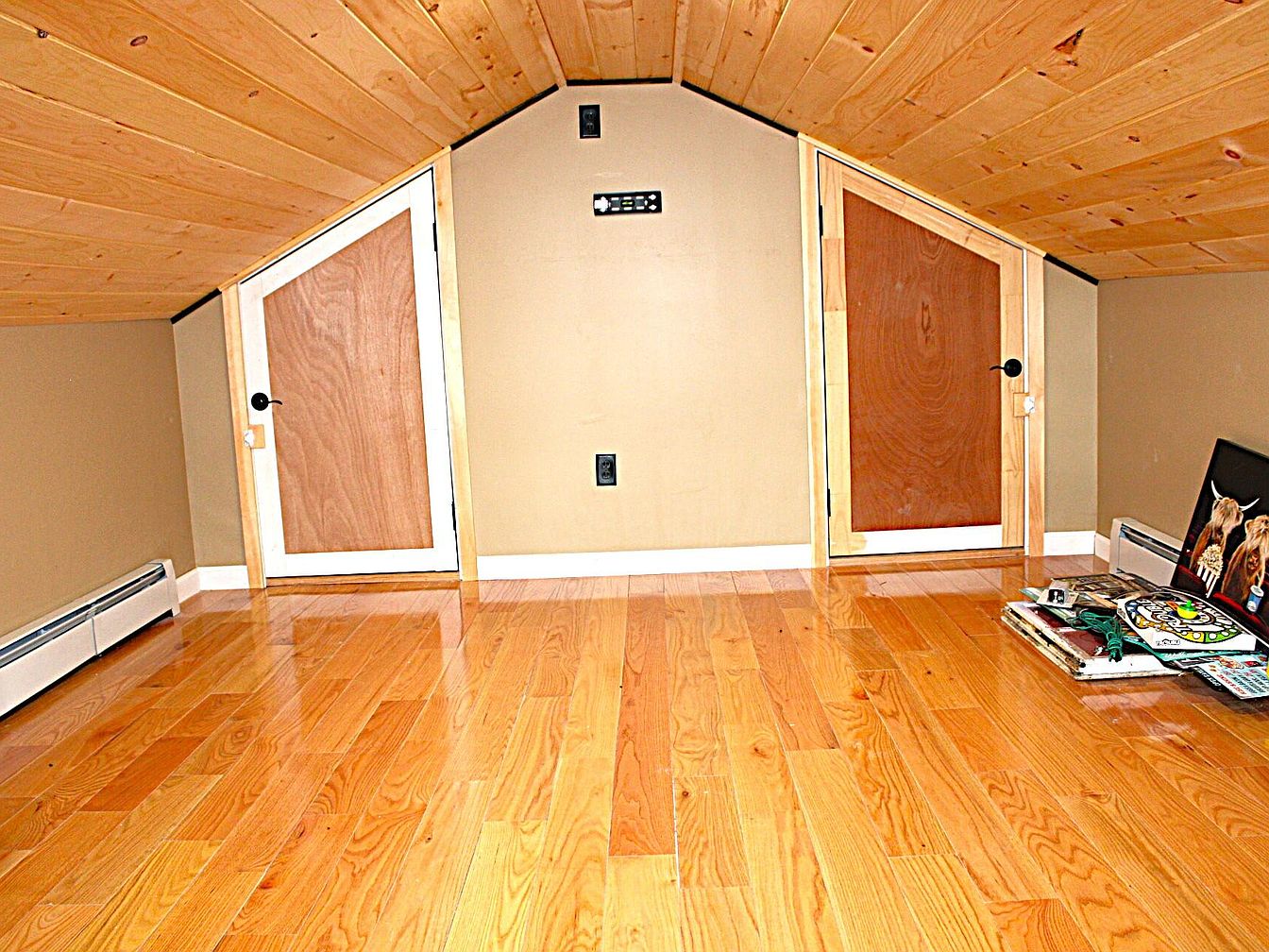 A cozy attic space with a pitched wooden ceiling made of natural planks, showcasing warm honey-toned hardwood floors. Two small, matching doors with angled tops are set into the sloped walls, providing access to crawl space storage. The walls are painted a muted beige, complementing the light wood elements. White baseboards outline the room while slender radiators run along the walls for heating. In the right corner, a small stack of magazines, a puzzle, and a framed horse print rest against the wall, adding a personal touch to the otherwise simple and uncluttered space.