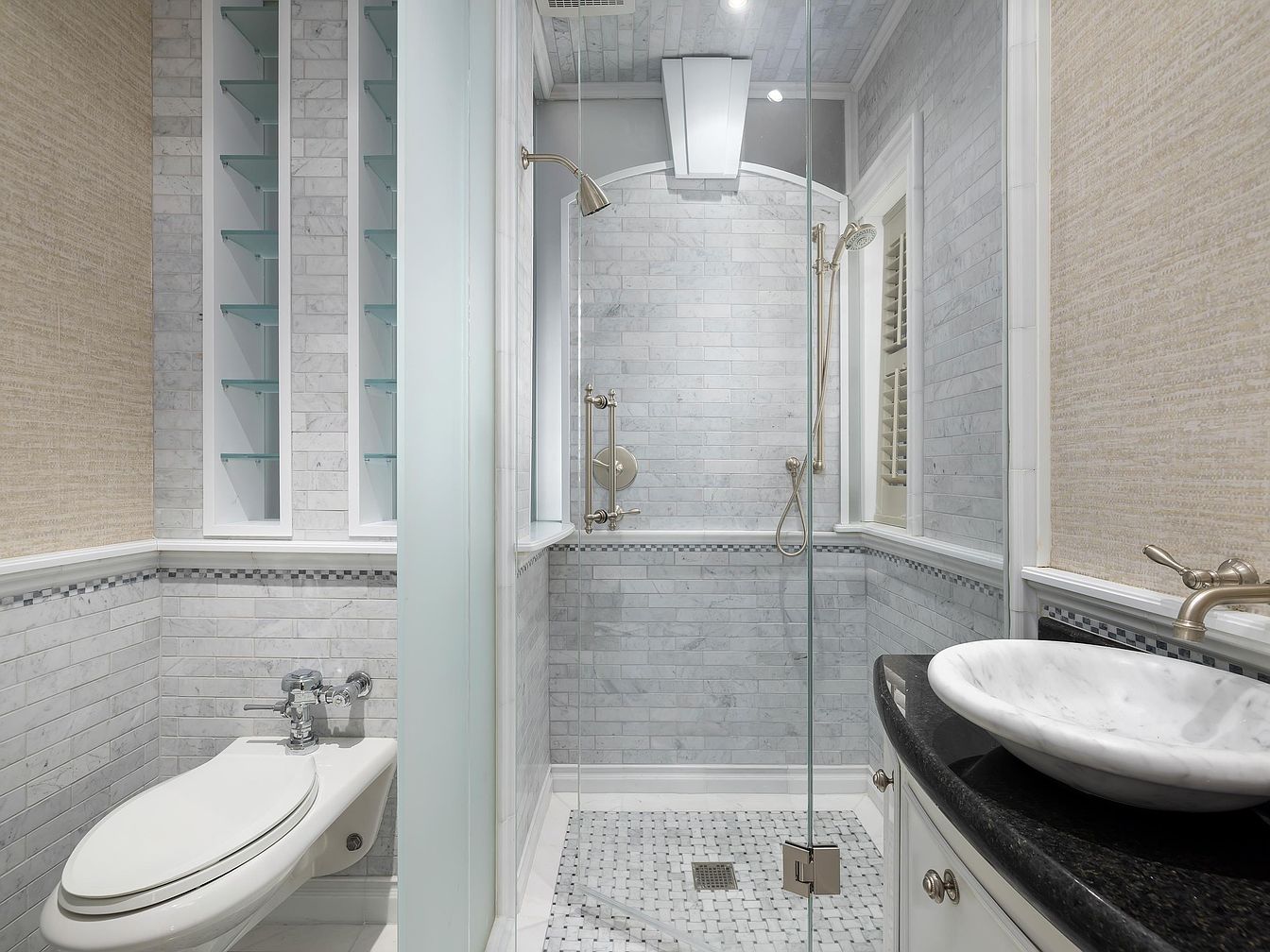 A compact, elegant bathroom dominated by cool gray marble tiles, covering the walls, shower space, and floors. A glass-enclosed shower sits at the far end, featuring gold and chrome fixtures, with a large geometric overhead light adding modern flair. Built-in wall shelves with glass inserts offer sleek storage near the toilet. An oval marble vessel sink rests atop a black counter with traditional cabinetry. The walls combine marble and textured wallpaper, arranged above a chair rail for visual interest. Subtle checkerboard trim adds a hint of ornamental detail. White wooden trim and window shutters complete the sophisticated, timeless look.