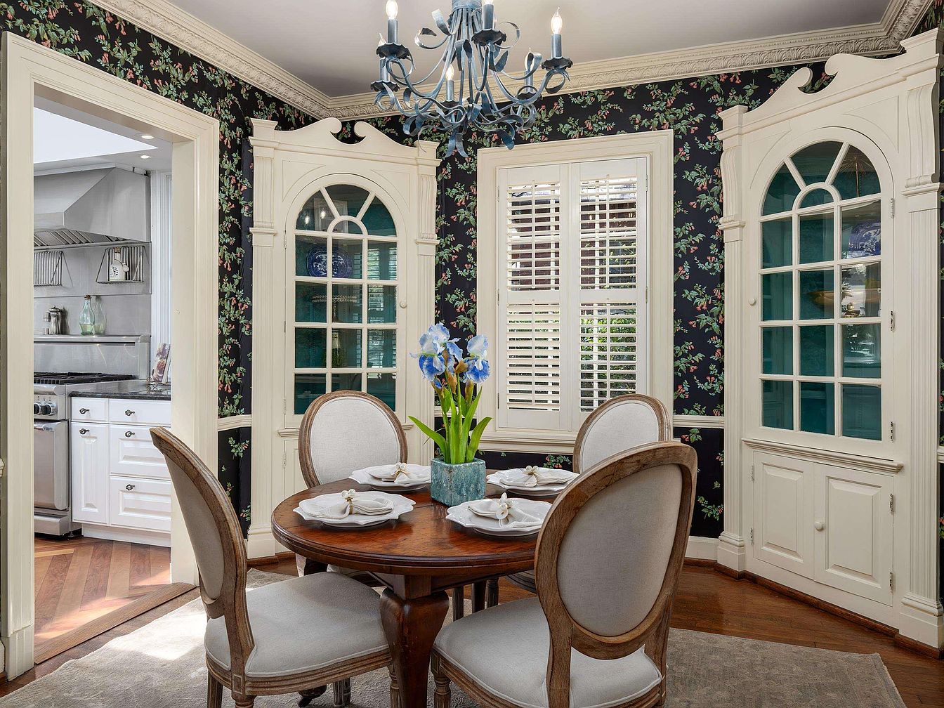 A small, elegant dining area designed for intimate meals features a round wooden table surrounded by four upholstered chairs with light beige cushions and weathered wood frames. The wallpaper is a striking black pattern adorned with delicate floral vines, lending a vintage, romantic charm. Built-in glass-front cabinets painted in cream flank the windows and corners, adding architectural interest. A soft blue chandelier hangs overhead, complementing the blue floral centerpiece on the table. Large white shuttered windows bring in natural light, and detailed crown molding accents the room. An open doorway provides a glimpse into a white kitchen with stainless appliances.