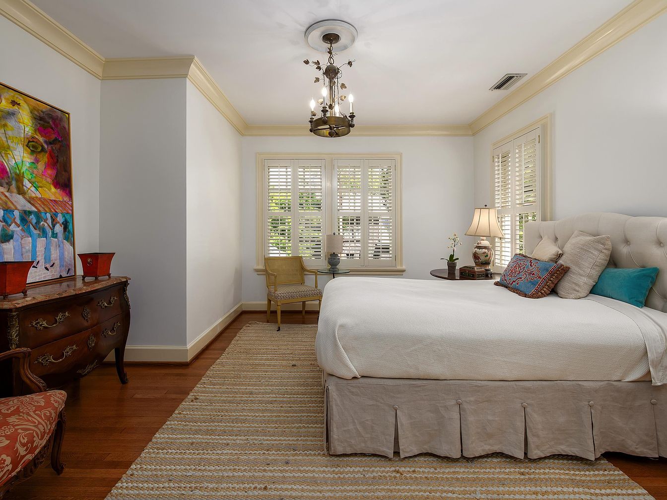 A bright, airy bedroom features pale walls with cream trim and crown molding, anchored by warm hardwood floors. The large bed has an upholstered, button-tufted headboard and is dressed in neutral bedding with colorful accent pillows. A woven area rug brings texture beneath the bed. Beside the bed sits an ornate wooden nightstand holding a floral lamp and a delicate orchid. A classic chair in light tones stands near shuttered windows that bring in natural light. Opposite the bed, a richly carved dresser displays vibrant modern art and red glass accents, blending historic charm with contemporary flair.