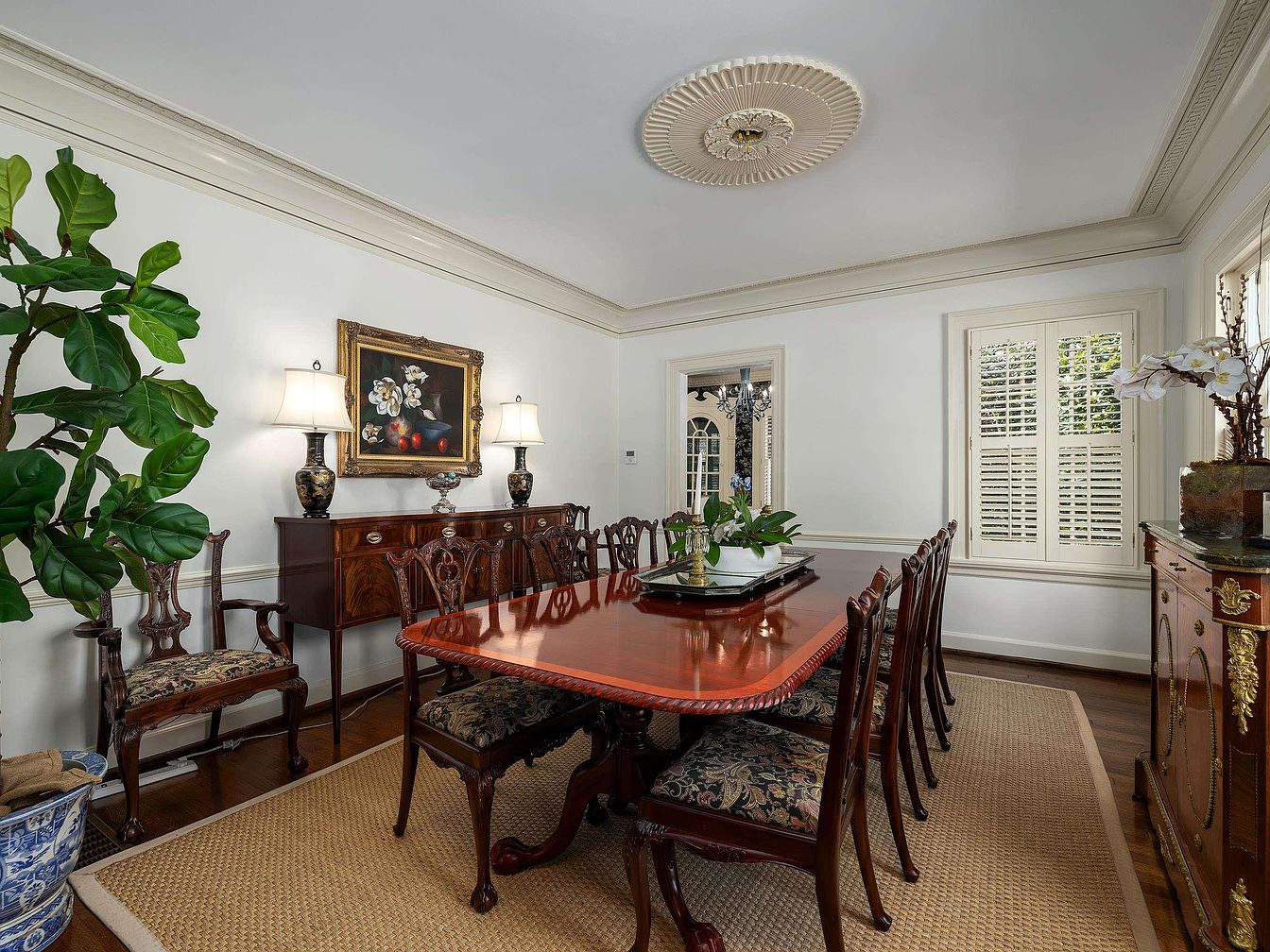 A formal dining room features a long polished mahogany dining table surrounded by intricately carved wooden chairs upholstered with dark, floral-patterned fabric. The table centerpiece is a tray with green foliage. Walls are painted in soft white, trimmed with cream-colored molding, and the large windows are fitted with plantation shutters. The ceiling is adorned with an ornate circular medallion. On one side, a sideboard holds two elegant lamps and a gold-framed floral painting, while a large potted plant in a blue-and-white ceramic planter stands nearby. Elegant credenzas flank the space, adding a traditional and sophisticated touch.