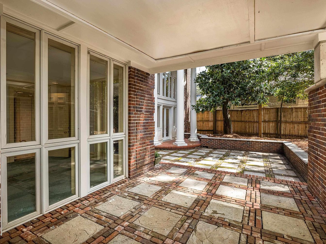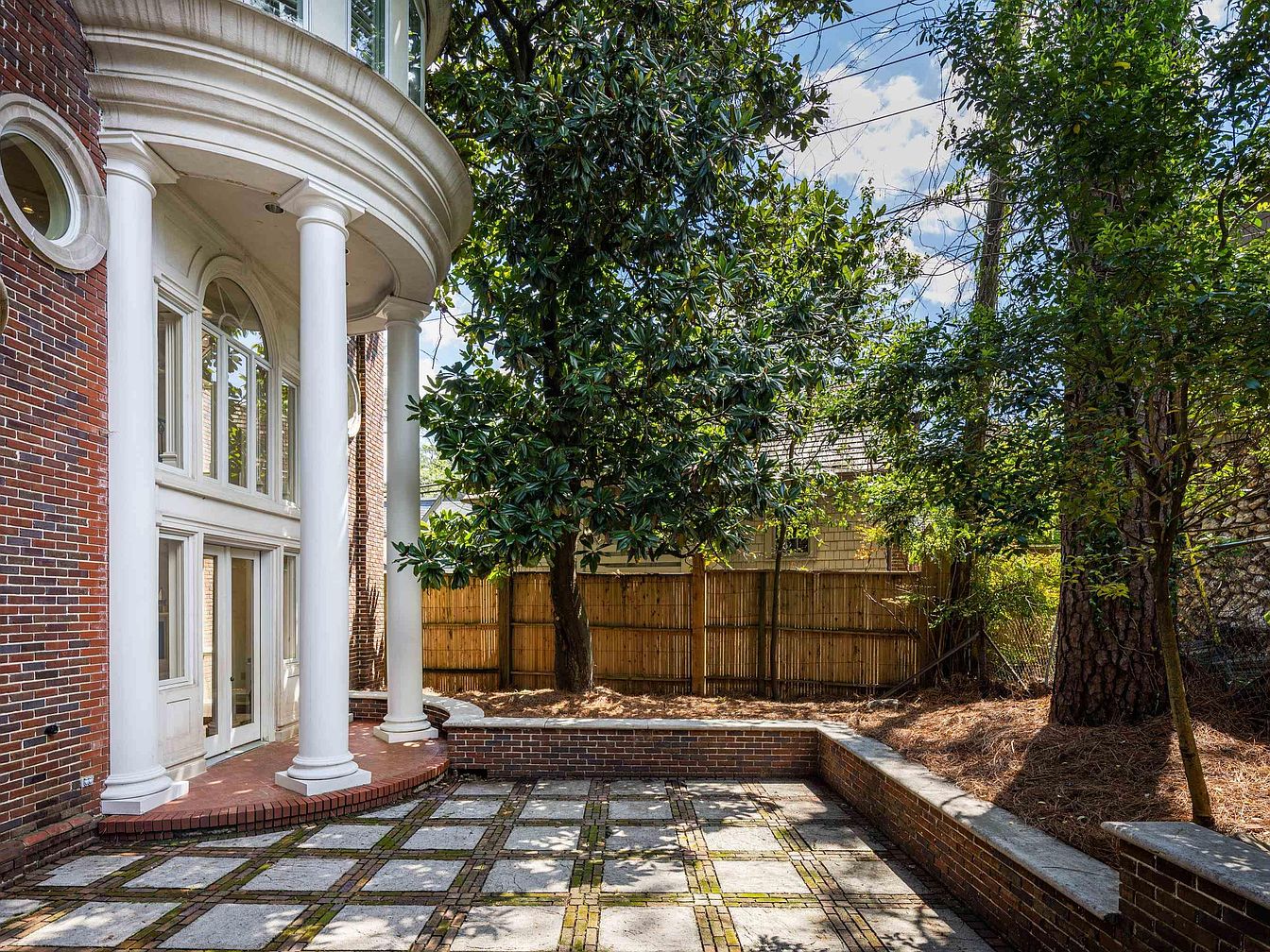 A sun-dappled patio sits behind the home, bordered by low brick walls and surrounded by mature trees and lush landscaping. Tall white columns support an elegantly curved overhang above large windows and a glass door, which allows plenty of natural light into the house. The red-brick exterior is complemented by white trim details and arched window frames for a touch of classical grandeur. The patio itself is paved in a checkerboard pattern using large square tiles and bricks, creating a stately yet inviting outdoor living space that blends well with the natural greenery and wooden privacy fence beyond.