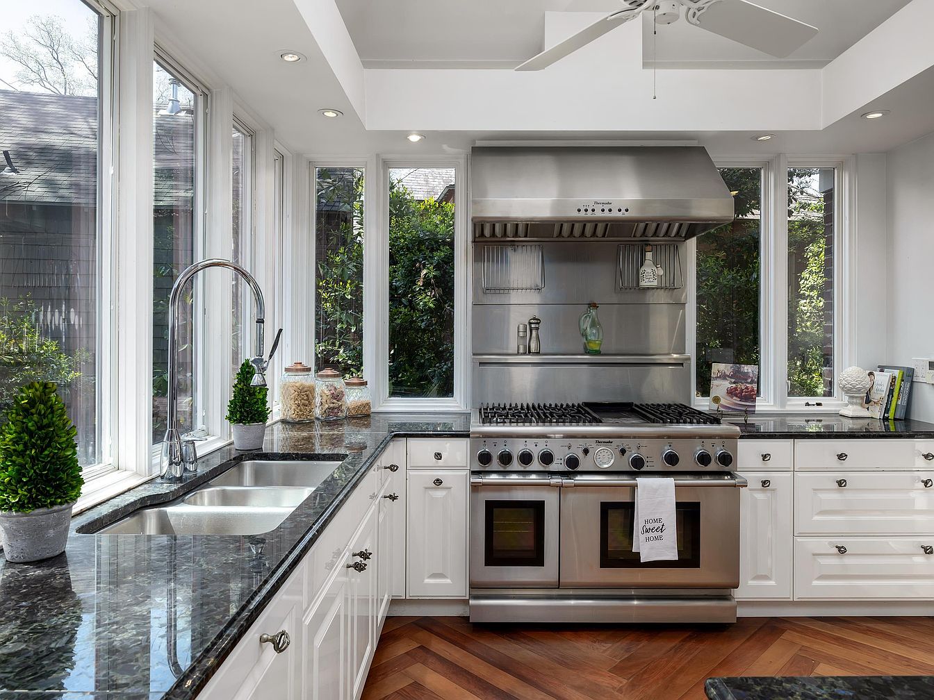 Bright and airy kitchen corner with a panoramic view created by tall, white-trimmed windows on two sides. Sleek black marble countertops run along the L-shaped counter, contrasting against crisp white cabinetry with polished silver knobs. The double stainless steel sink features a high-arc faucet, accompanied by small potted plants. Large stainless steel professional stove with a vent hood dominates the back wall, displaying salt, pepper, and olive oil bottles. Light wood herringbone floors add warmth. Decorative glass jars with pantry items, a cookbook, and a white ceiling fan overhead contribute to the clean, modern, and inviting atmosphere.
