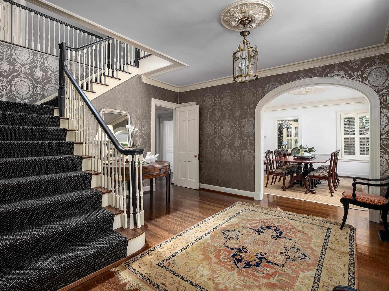 A grand entry hallway is anchored by a sweeping staircase with dark-patterned carpet, cream spindles, and a glossy black handrail. Ornate wallpaper in taupe and silver covers the walls, complementing polished wood floors that gleam under soft light. An intricate ceiling medallion with brass lantern adds historic flair. A Persian-inspired rug with coral, navy, and ivory hues defines the main area. A wooden side table topped with decorative porcelain sits against the wallpapered wall. Through an arched doorway, a formal dining room is visible, furnished with dark wood chairs and sunlit by tall shuttered windows.