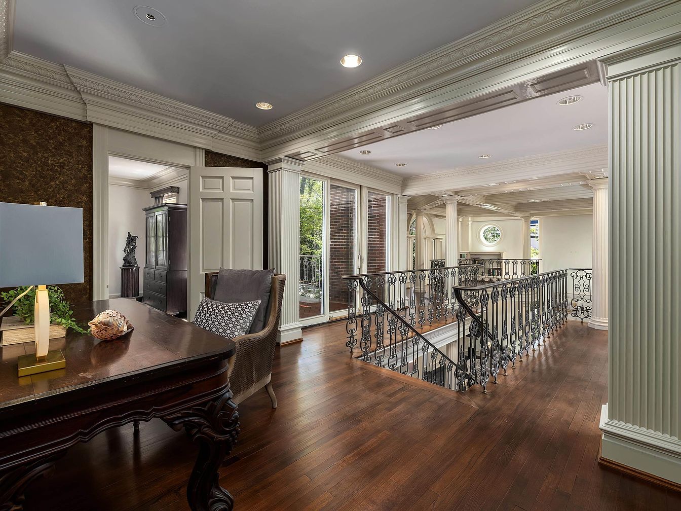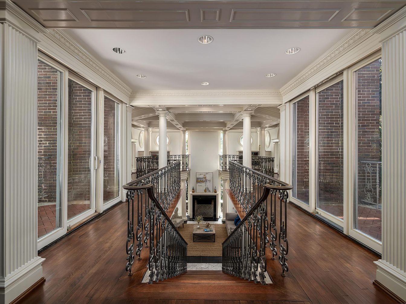 A spacious upper landing area features elegant dark wood floors and ornate black wrought iron railings that frame a sweeping staircase. The perimeter of the space is bordered by floor-to-ceiling windows, allowing natural light to pour in and offering views of the exterior brick walls and terrace. Broad, fluted columns painted in creamy white anchor the open layout, while intricate molding and paneled ceiling details add classic sophistication. Below, a glimpse of a fireplace and tasteful seating area hints at the inviting living space downstairs, completing the stately and airy ambiance of this prominent hallway.