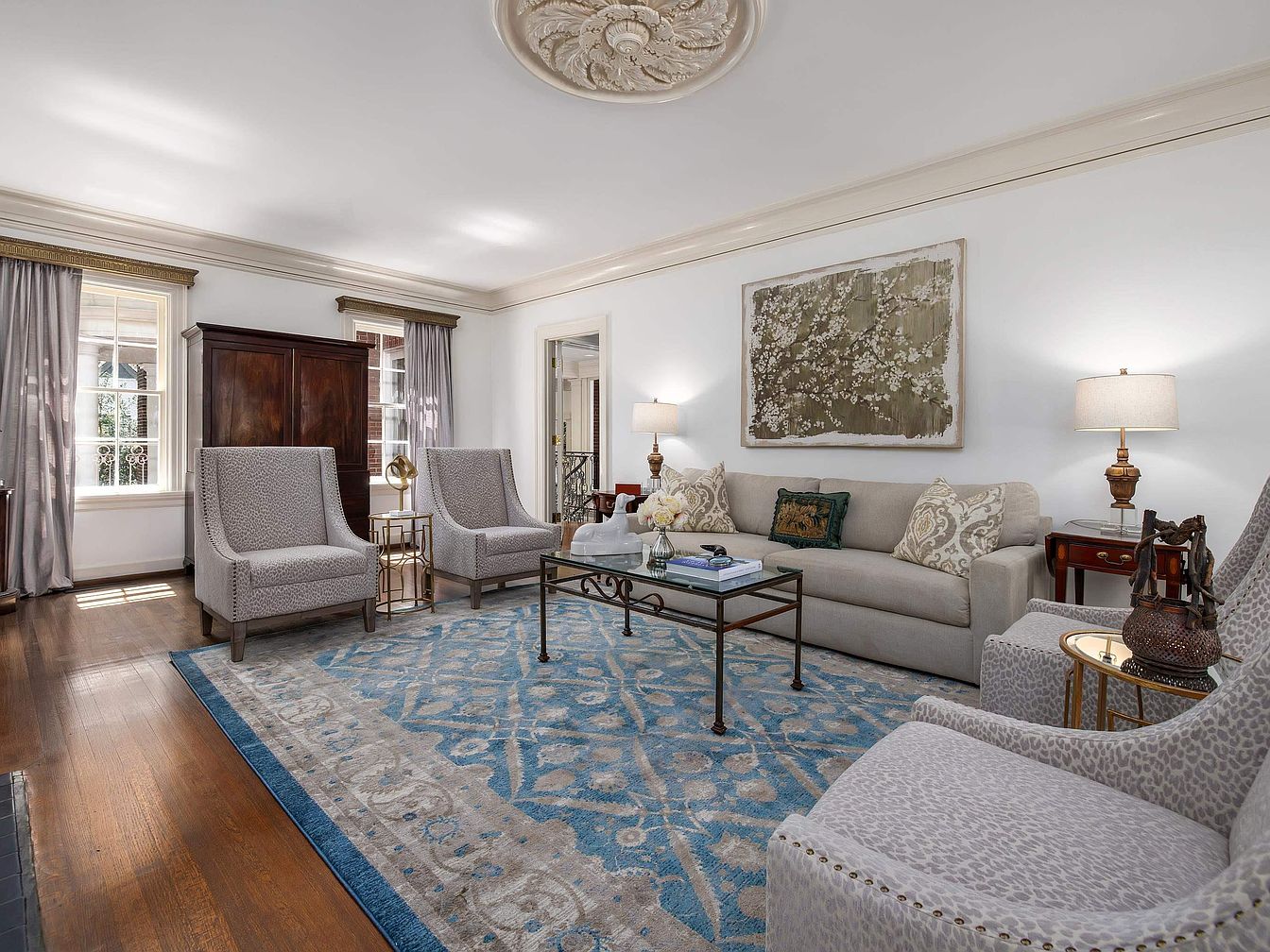 A spacious living room featuring a harmonious blend of classic and contemporary design elements. The room is anchored by a large, patterned area rug in shades of blue and gray that covers polished hardwood floors. Elegant light gray armchairs with subtle patterns face a long, neutral-toned sofa adorned with decorative throw pillows. Rich wooden end tables with matching lamps flank either end of the sofa, while a sophisticated armoire and gold-accented side tables provide further warmth. The walls are painted a crisp white and complemented by crown molding and ornate ceiling medallion, with soft drapery framing tall windows that let in ample natural light. A botanical painting above the sofa adds a gentle, artistic touch.