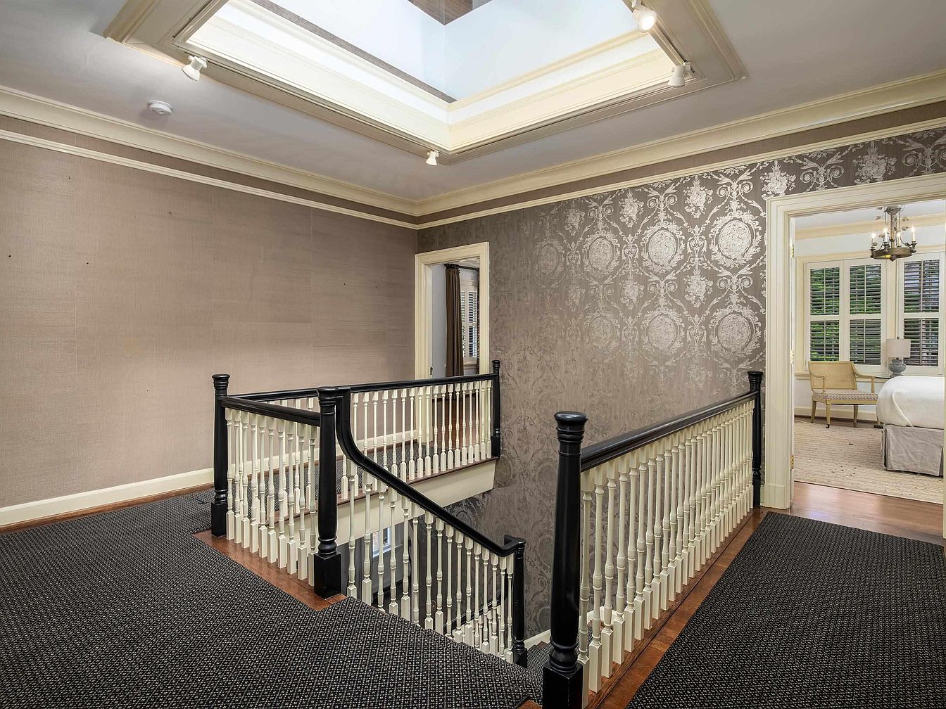 A spacious upstairs landing features an elegant skylight that floods the space with natural light. The area is bordered by a classic staircase with white spindles and glossy dark wood handrails, providing a dramatic contrast. The wall to the right is adorned with ornate Victorian-style silver damask wallpaper, while the opposite wall is papered in a softer, textured neutral tone. The floor is covered with a dark, patterned carpet. Through the doorway, a glimpse of a serene bedroom is visible, with large windows, white bedding, and a delicate chandelier, highlighting the refined historic character of the home.