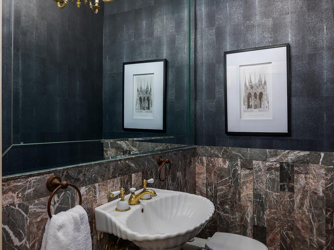 A small, elegant powder room features a white, scalloped-edge pedestal sink with ornate gold-tone faucet handles and a coordinating gold towel ring holding a white hand towel. The walls display a sophisticated mix of dark, shimmering textured wallpaper above, paired with rich, veined marble tiles in deep browns, grays, and pinks along the lower half. A wide mirror runs along two walls above the sink, expanding the space visually. Framed architectural art prints add a refined, classic touch. The overall palette blends deep hues with metallic and stone surfaces, creating a luxurious and historic atmosphere.