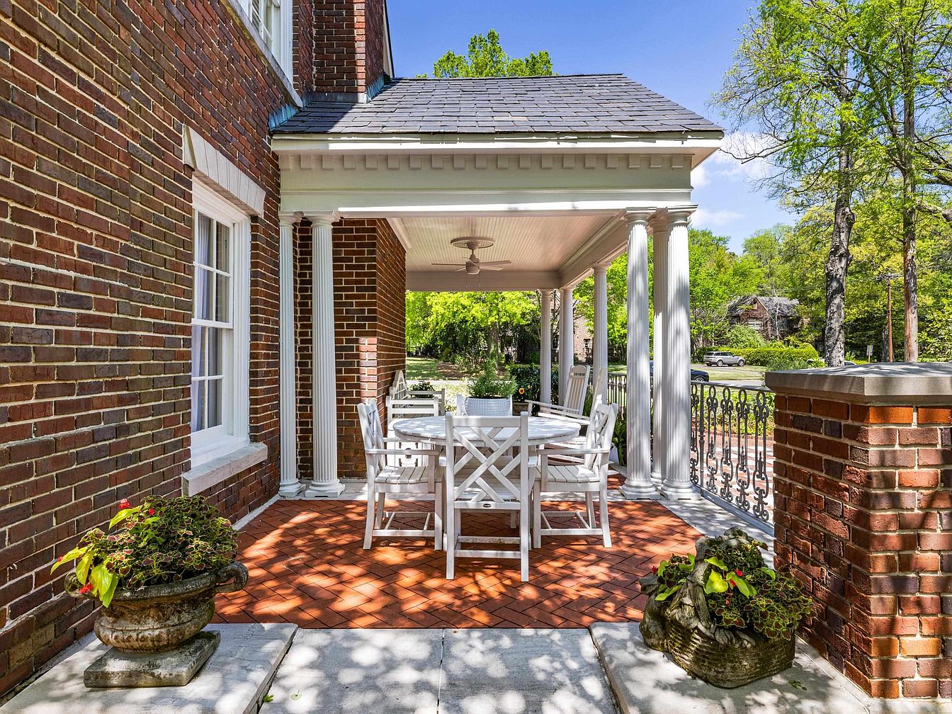 A spacious front porch features classic red brick flooring laid in a herringbone pattern, echoing the historic facade of the home. White painted columns support a crisp white roof, providing shade and architectural elegance. A white wooden dining table set with matching chairs is centered under a ceiling fan, creating a welcoming space for outdoor meals or gatherings. Ornamental planters with lush green foliage frame the entrance, while wrought iron railings add a touch of vintage charm. The porch offers a serene view of the leafy front yard and the tranquil residential street beyond.