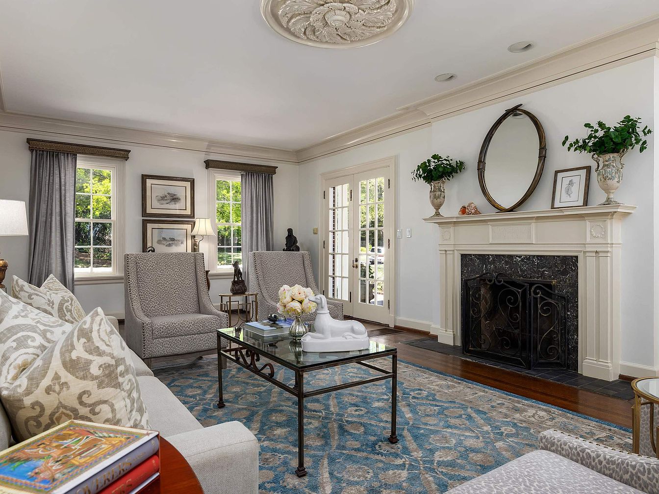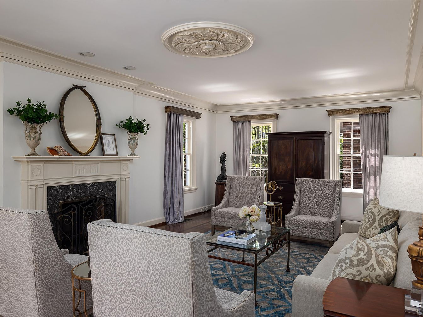 A sophisticated living room with a soft, neutral palette, featuring cream walls and detailed crown molding. Two tall windows with classical drapes let in ample daylight, framing two patterned armchairs set around a glass coffee table with an ornate metal base. A pale, plush sofa with decorative pillows sits nearby, facing an elegant fireplace with a black marble surround and white mantel, adorned with greenery in urns, a round mirror, and framed art. The room’s blue patterned area rug adds a subtle pop of color, while ceiling medallions and hardwood flooring complete the classic aesthetic.