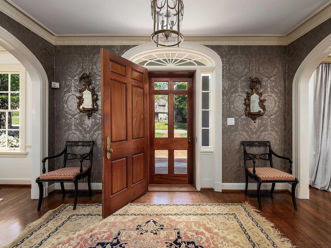 A stately entrance with a rich wooden front door features a fan-shaped transom window above and sidelights on each side, allowing abundant natural light. The walls are covered in intricate, silver-grey damask wallpaper, lending an elegant, historic charm. Two ornate, dark wood chairs with patterned upholstery sit opposite each other, flanking the doorway, while gilded, decorative mirrors hang above each chair. The hardwood floors are adorned with a large, patterned area rug in cream, rose, and navy tones. Detailed crown molding and soft archways give the space an inviting, sophisticated feel.