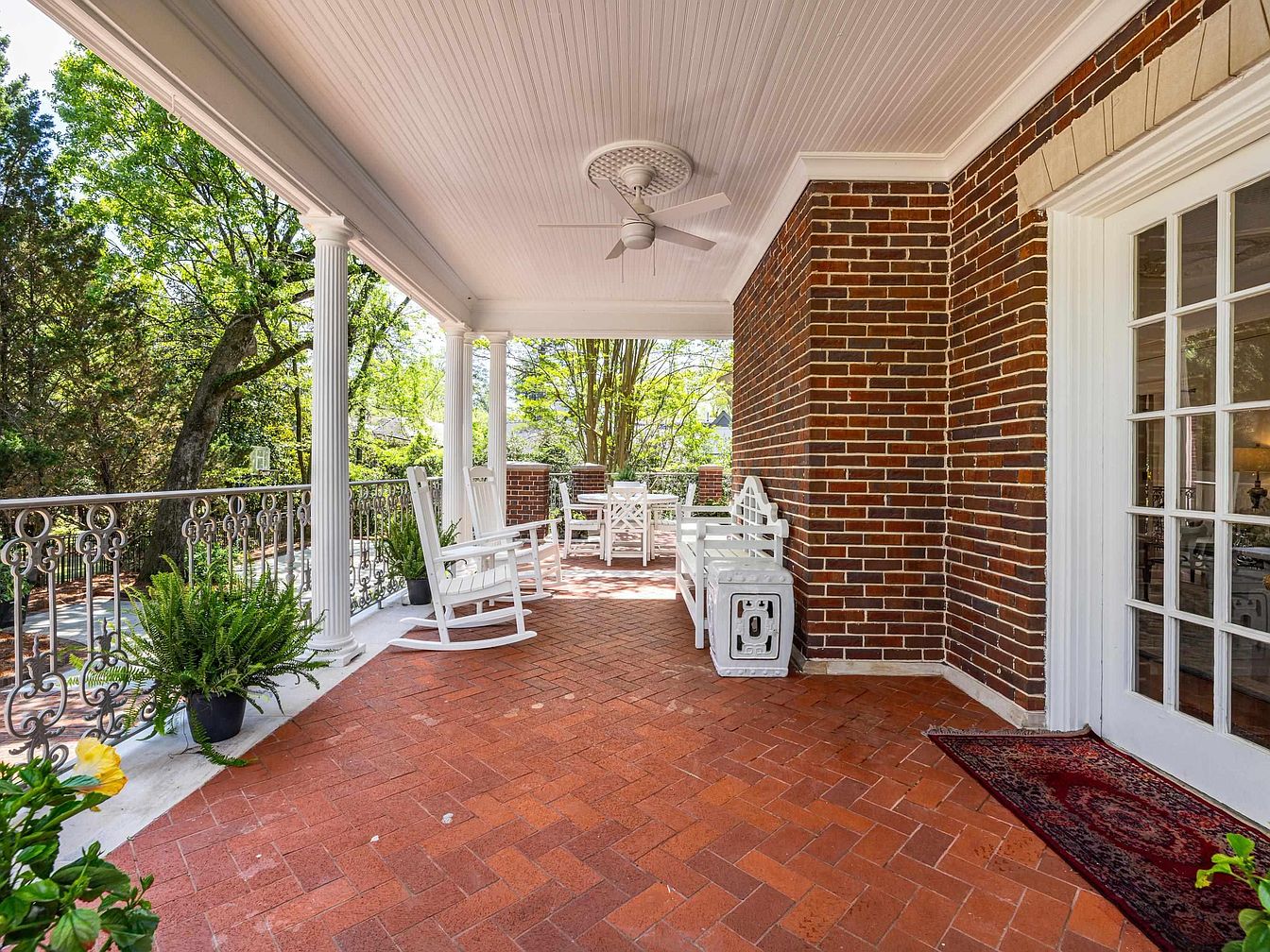 A spacious covered porch features a floor of red herringbone brick, surrounding brick walls, and sturdy white columns supporting a beadboard ceiling with a central white ceiling fan. Classic white rocking chairs and a white wooden bench offer inviting seating, complemented by white side tables and a patterned outdoor rug in front of French doors leading inside. Potted ferns and leafy plants line the metal, decorative railing for a touch of greenery. The porch overlooks mature trees, creating a peaceful, shaded space for relaxation and conversation that feels both traditional and welcoming.