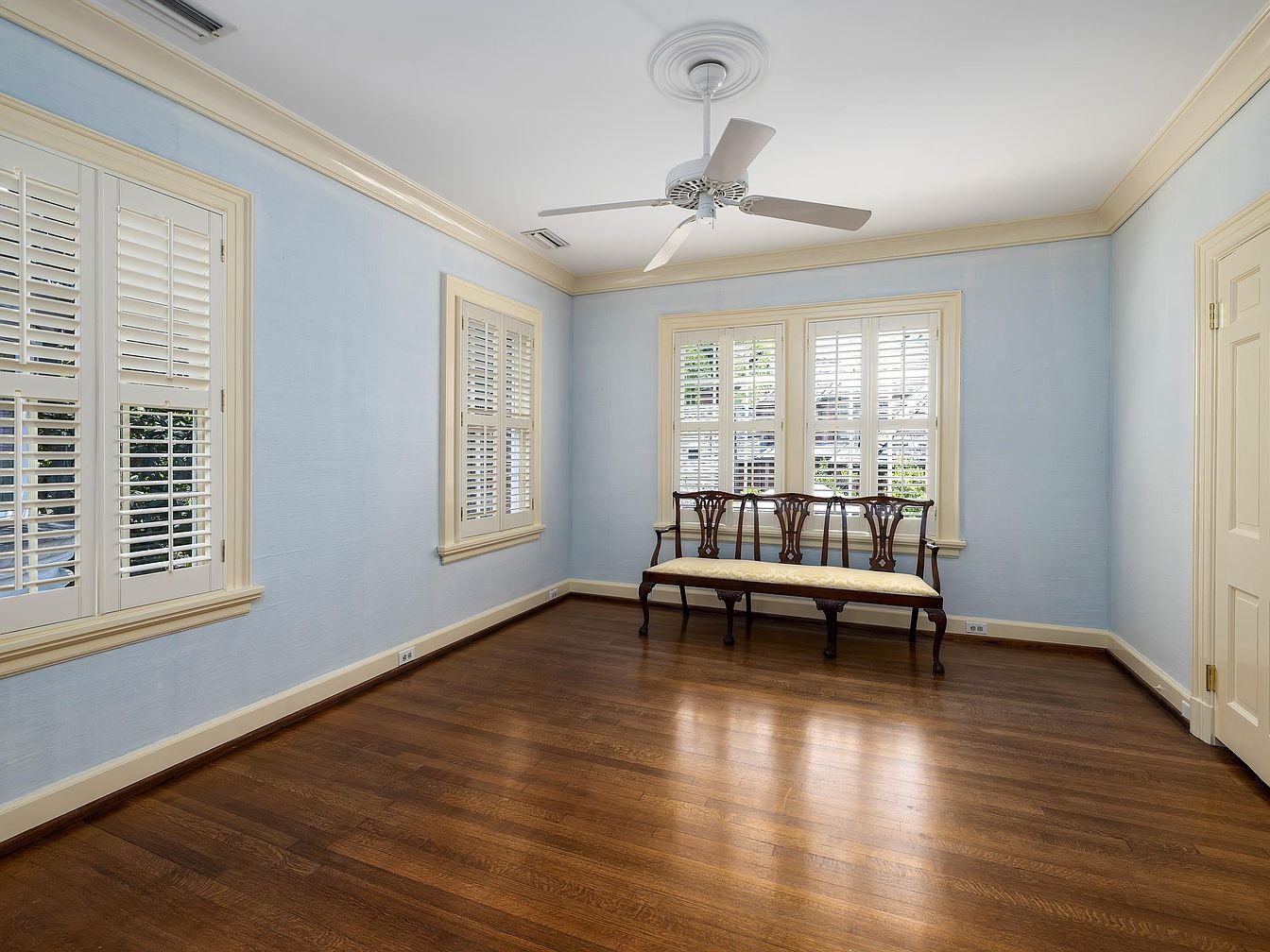 A small, bright sitting room with polished hardwood floors and light blue walls, accented by cream-colored trim and crown molding. The room is illuminated by natural light coming through three large windows, each fitted with white plantation shutters. In front of the largest window is an antique wooden bench upholstered in pale yellow fabric, adding a touch of classical elegance to the space. The white ceiling is adorned with a simple ceiling medallion and a modern white ceiling fan. The space feels airy and formal, with a refined color palette that enhances its historic charm.