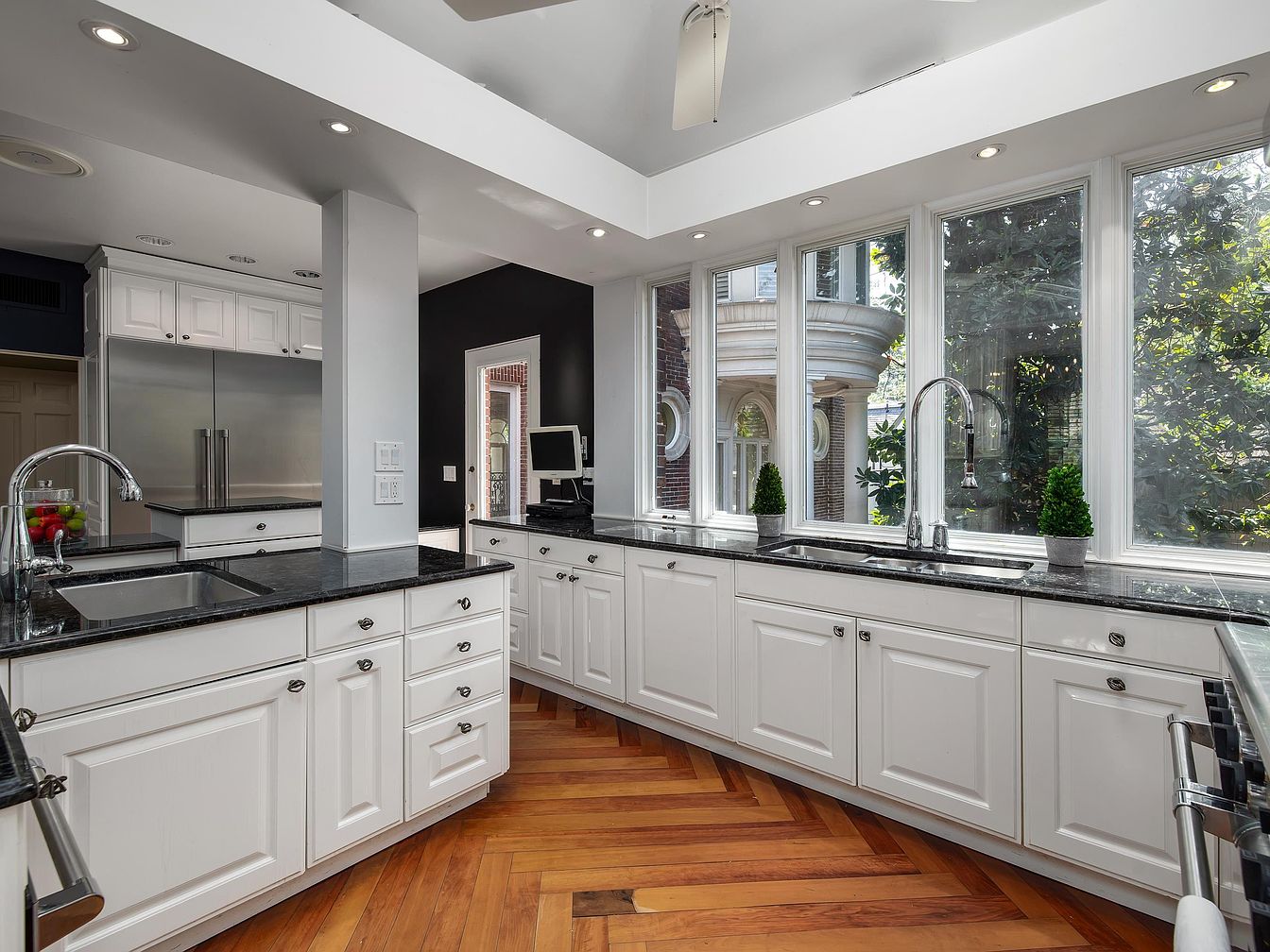 Bright, modern kitchen featuring white cabinetry with black granite countertops and stainless steel fixtures. Large windows line one wall, providing a view of classic architectural columns and lush greenery outside. The chevron-patterned hardwood floor adds warmth and texture to the otherwise crisp, contemporary space. Recessed ceiling lights are subtly arranged, enhancing the spacious, open feel. Small potted plants by the sinks introduce a touch of green indoors. Sleek built-in appliances, including a double-door refrigerator, complete this clean and elegant design. The space balances historic external views with updated, sophisticated interior finishes and functional, uncluttered surfaces.