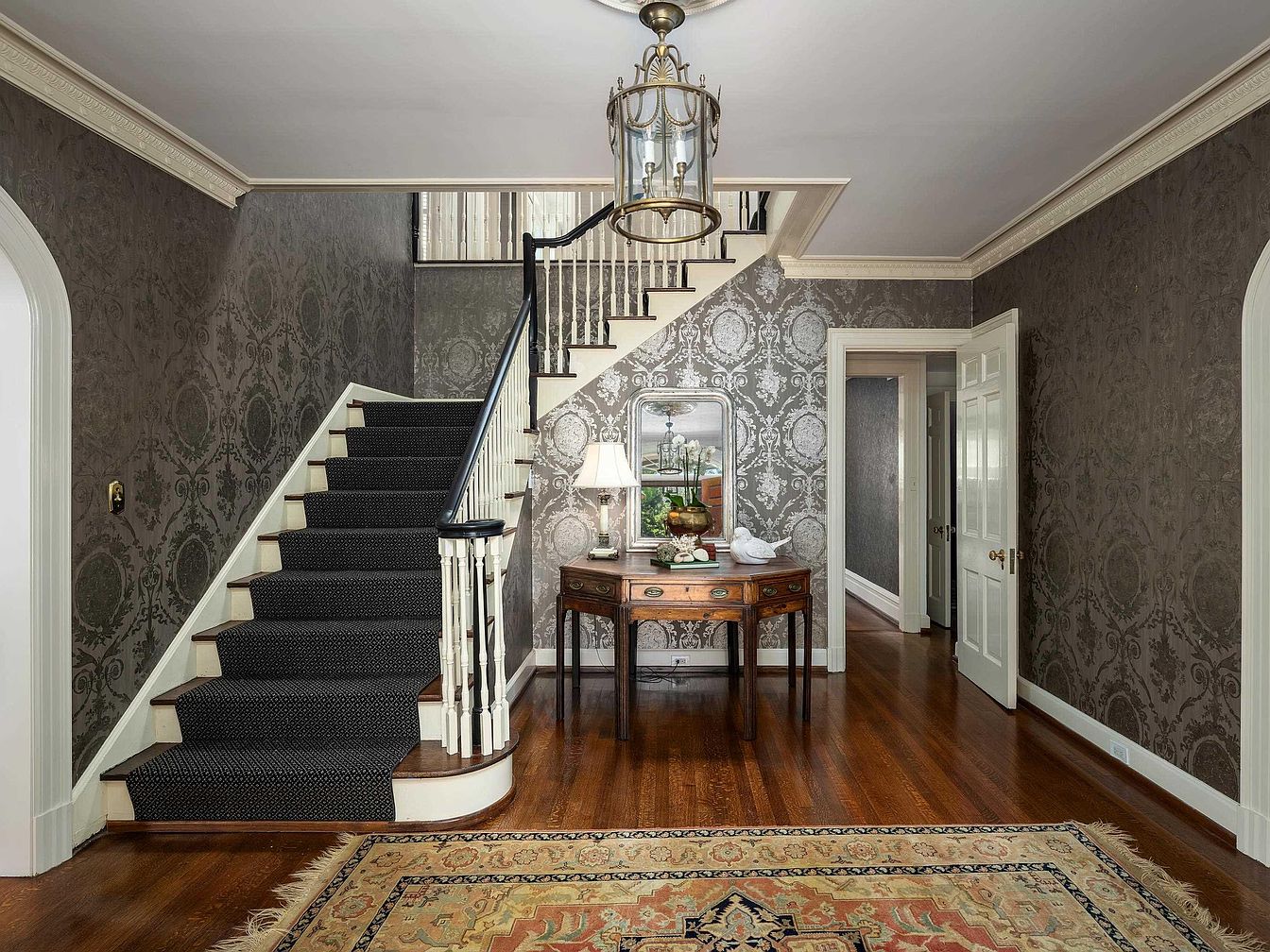 Wide foyer area with a grand staircase curving upward to the left, featuring dark carpet runners and white bannisters with black railings. Rich, chocolate brown damask wallpaper covers the walls, complemented by intricate white crown molding. An antique wooden console table sits against the main wall beneath a large gilded mirror, decorated with a table lamp and classic ceramic accessories. A vintage patterned rug in muted tones of orange and blue lies on polished hardwood floors, tying the space together. Overhead, a traditional brass and glass lantern-style chandelier provides elegant lighting for this stately entrance.