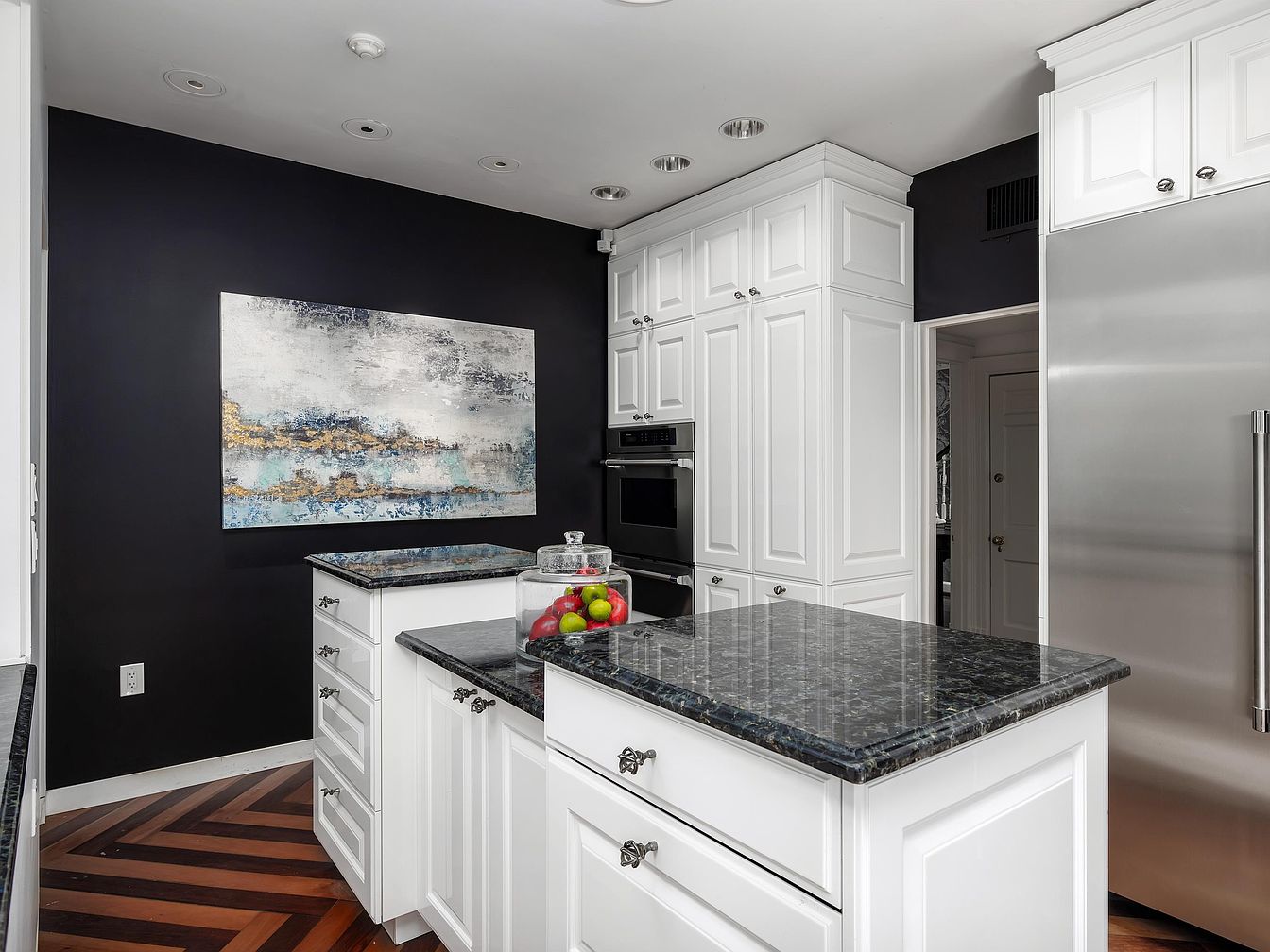 A modern kitchen features white paneled cabinetry from floor to ceiling, giving the room a crisp, clean look. A central island with dark granite countertop provides prep space, with a glass jar of bright fruit adding a pop of color. The geometric chevron wood flooring adds warmth and a touch of vintage elegance to the space. The black accent wall at the back is adorned with a large abstract painting in shades of blue, gold, and gray, creating a sophisticated contrast to the white cabinetry. Stainless steel appliances and recessed lighting contribute to a refined, contemporary atmosphere.