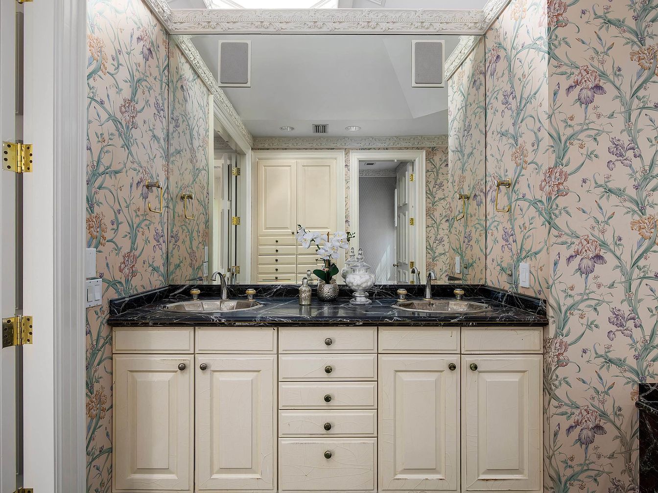 Double vanity area features cream cabinetry with slight patina and black marble countertops, each with separate sinks and gold-toned fixtures. Large wall mirrors create depth, reflecting the pastel floral wallpaper that wraps around the space with a delicate botanical motif. The wallpaper blends soft pinks, greens, and lavenders, evoking a classic and elegant ambiance. Ornate crown molding frames the ceiling, providing an additional touch of sophistication. Brass towel holders and hardware accent the sinks, while decorative objects, such as a white orchid and glass apothecary jars, rest on the countertop, adding charm and refinement to the bathroom’s overall aesthetic.