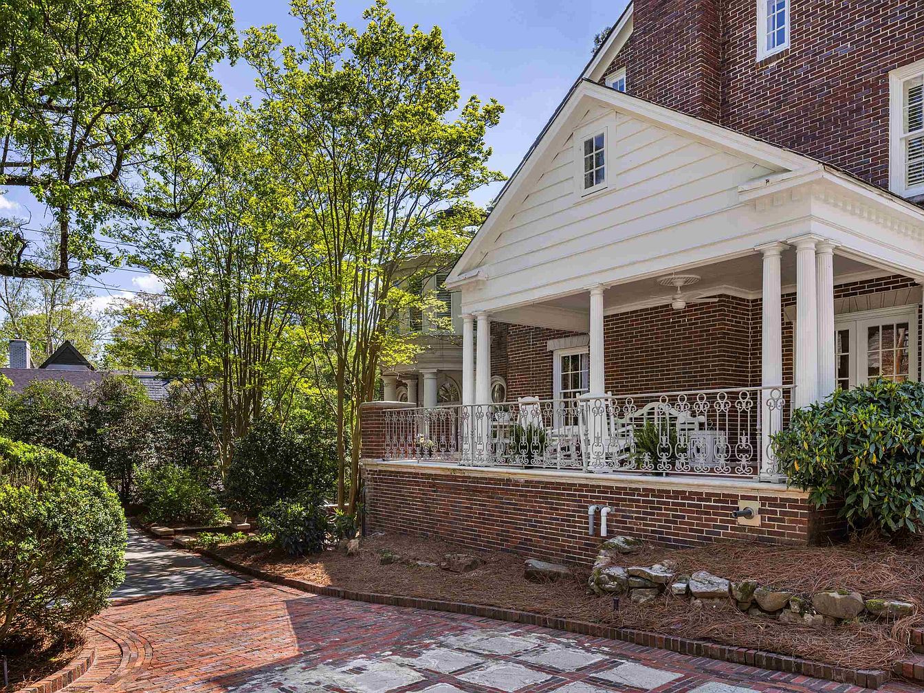 A stately brick front porch features white columns and decorative wrought iron railing, exuding classic Southern charm. The porch roof peaks in a gable, detailed with white trim work. White rocking chairs and lush potted plants create a welcoming seating area. Surrounding the porch, mature trees and well-tended shrubs add privacy and frame the red brick façade. A winding brick walkway leads to the entrance, bordered by low hedges and shaded by leafy branches, evoking a sense of timeless elegance. Natural light highlights the traditional design, enhancing the inviting, tranquil atmosphere of this exterior space.