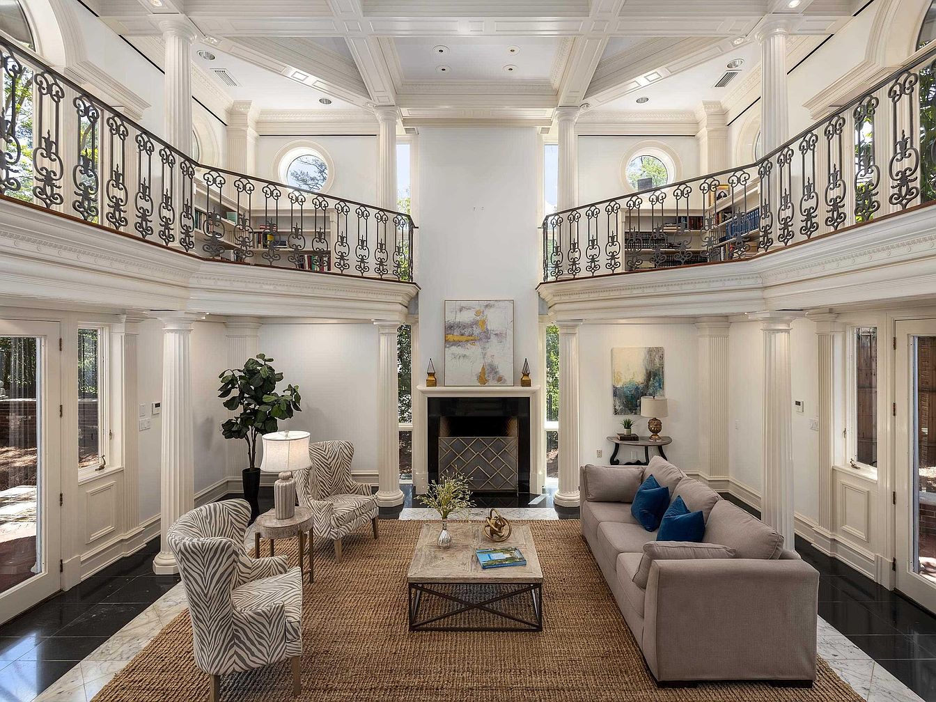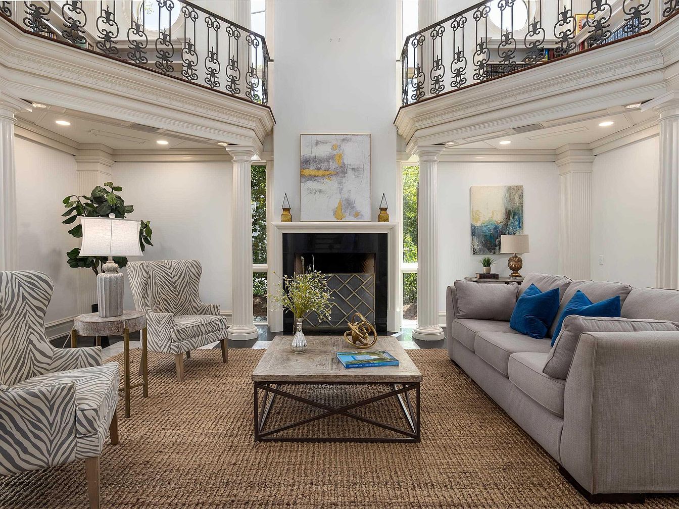 A grand double-height living room with classical architectural elements and tasteful contemporary furnishings. White fluted columns support an overhead gallery with ornate wrought-iron railings, adding a sense of historical sophistication. The walls are painted a soft white, which pairs with the light grey sectional sofa adorned with deep blue accent pillows. Two striking zebra-patterned armchairs flank a rustic wooden coffee table, set on a textured natural fiber rug. Modern abstract artwork hangs above a black fireplace with gold accents. Subtle greenery, table lamps, and layered lighting enhance the inviting, carefully curated space with elegant traditional and modern fusion.