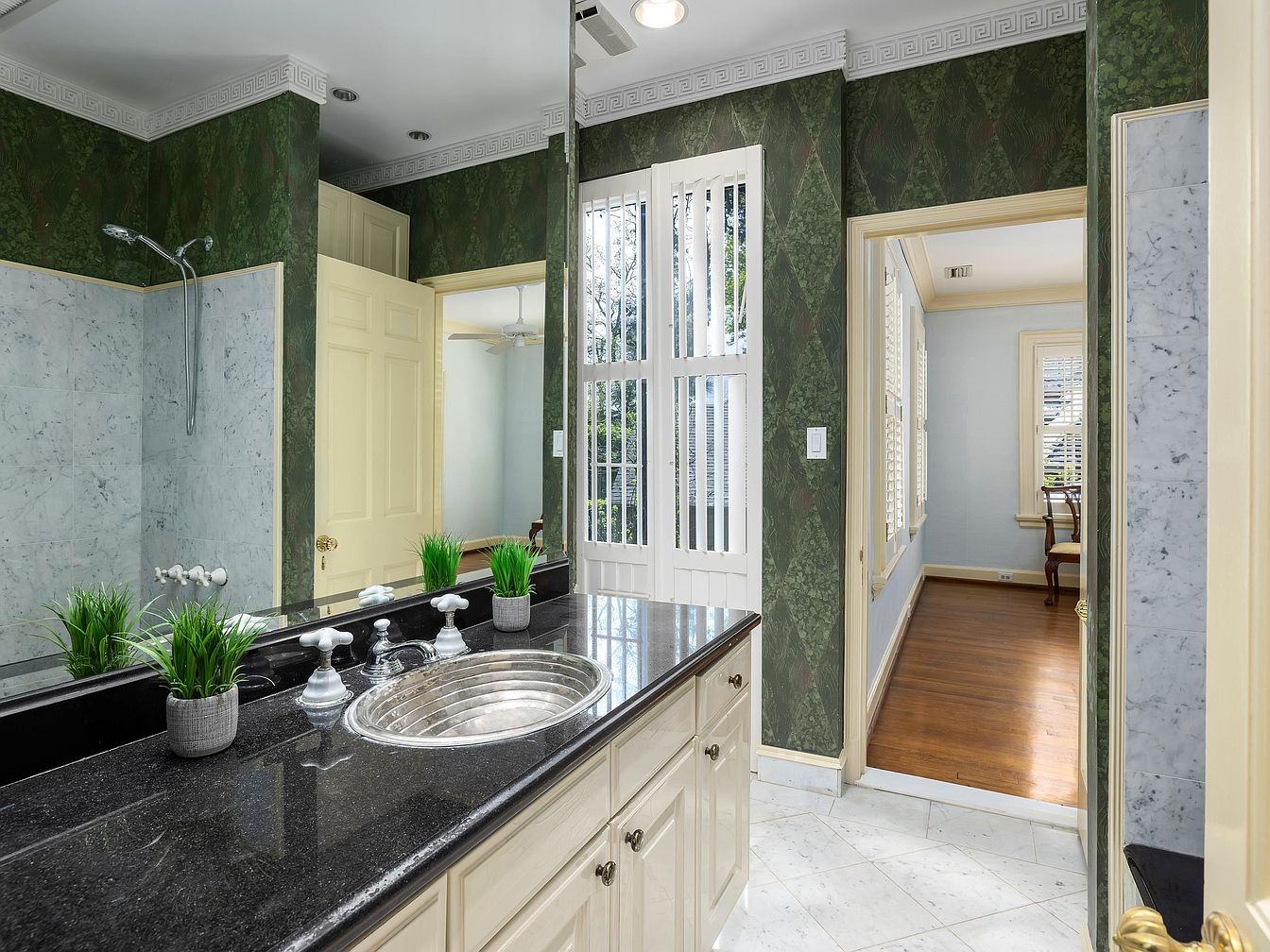Classic bathroom featuring a black marble countertop with a metallic sink and traditional silver-tone faucets. Three small potted plants add a touch of freshness and greenery to the black vanity surface. The cabinetry is painted cream, matching the trim and doors throughout the space. Walls exhibit dark green patterned wallpaper framed with marble tiles, lending a rich, historic feel. A large mirror above the counter visually doubles the space, while ornate crown molding with a Greek key design adds an elegant touch. The bathroom opens into a hallway with polished wood flooring, light blue walls, and abundant natural light from shuttered windows.