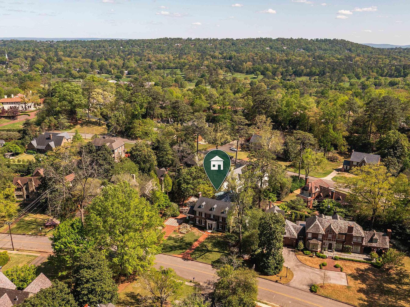 A sweeping aerial perspective focuses on a historic residential neighborhood filled with mature trees, winding streets, and spacious lots. At the center, a marker pinpoints an elegant two-story house, distinguished by a dark roof, tall windows, and an inviting red-brick pathway leading to the entrance. Surrounding homes display diverse architectural styles, with stone and brick facades, chimneys, and expansive lawns. The abundant greenery of the trees creates a serene, picturesque setting, while the distant view of rolling hills and forested areas adds to the charm. The overall atmosphere communicates tranquility and established neighborhood character.