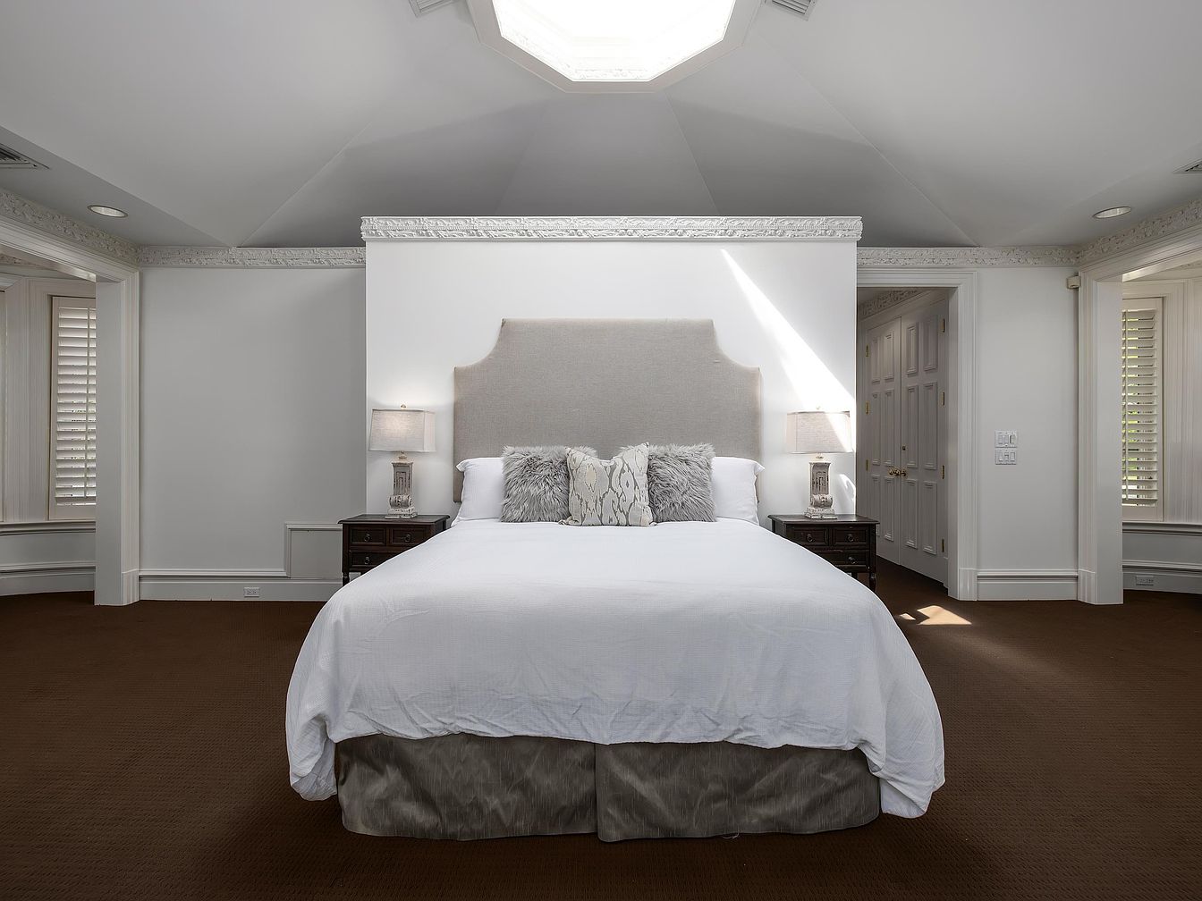 A spacious bedroom with a grand, symmetrical layout centers around a large bed with a tall, upholstered headboard in a soft taupe fabric. The bed is dressed in crisp white linens and accented by a trio of decorative throw pillows in pale gray and silver. Matching dark wooden nightstands flank both sides of the bed, each topped with an elegant table lamp. Crown molding details the perimeter of the ceiling, which rises to a central octagonal skylight, filling the room with natural light. The walls are painted a soft white, contrasting with plush, deep brown carpeting, while tall windows with plantation shutters provide additional light and privacy.