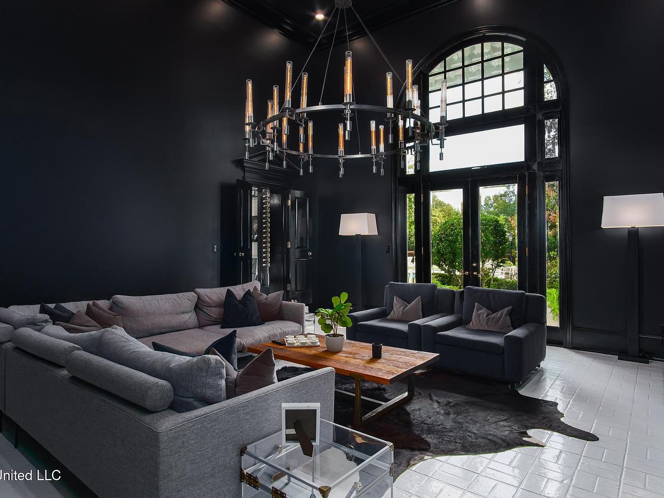 A spacious living room features striking black walls, creating a dramatic backdrop for the plush grey sectional sofa adorned with an assortment of pillows in varying textures and colors. A rustic wooden coffee table stands at the center, complemented by a unique cowhide area rug. Elegant lighting is provided by a contemporary chandelier, which hangs from the high ceiling, adding a touch of sophistication. Large windows and double doors, framed in glossy black, invite natural light and offer views of the lush greenery outside, enhancing the room’s inviting atmosphere. Two modern floor lamps provide additional illumination.