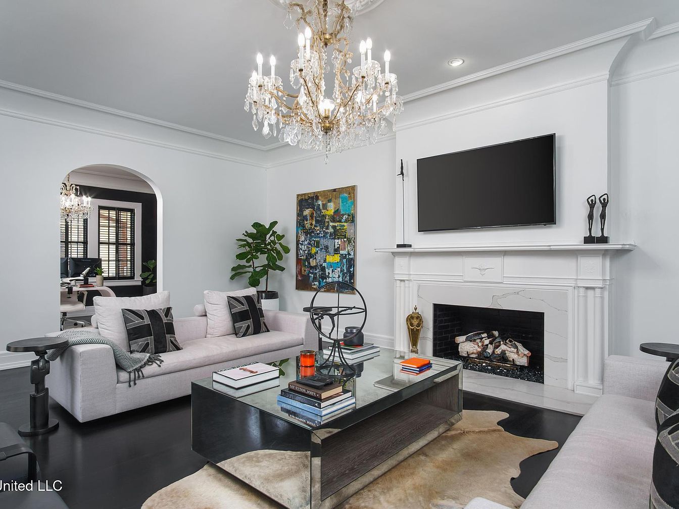 This living room exudes contemporary elegance with its light gray walls and dark hardwood floors. A statement crystal chandelier hangs from the ceiling, casting a warm glow over the space. Two plush, light-colored sofas adorned with bold patterned cushions create a cozy seating area, facing a sleek glass coffee table atop an organic-shaped cowhide rug. A black and white modern art piece adds a pop of color, contrasting nicely with the minimalist fireplace beneath a mounted television. Lush greenery from a potted plant brings life to the room, enhancing its inviting atmosphere, while arched openings frame the adjacent office area.